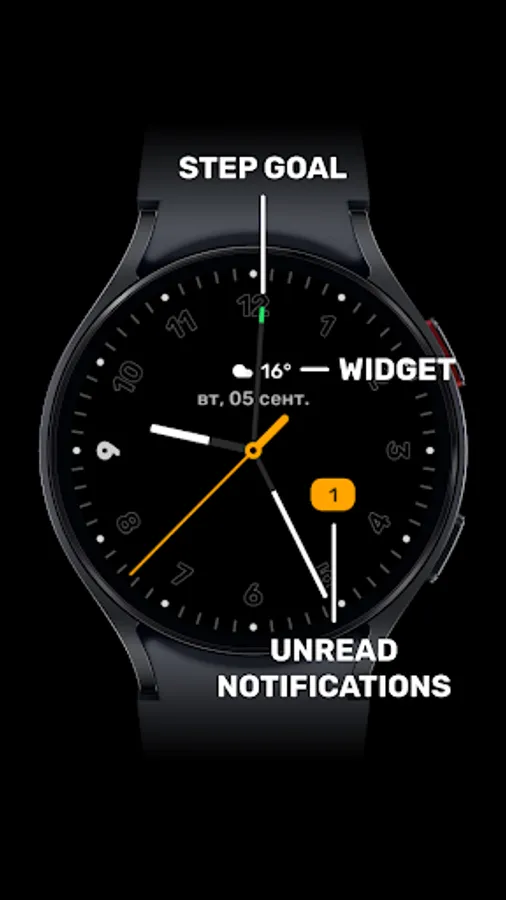 Minimalistic watch face for Wear OS with step, weather and unread notifications display.