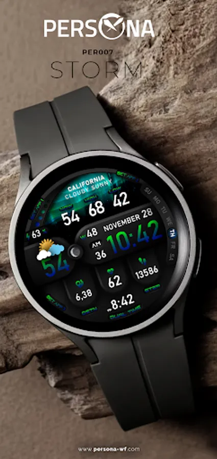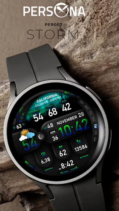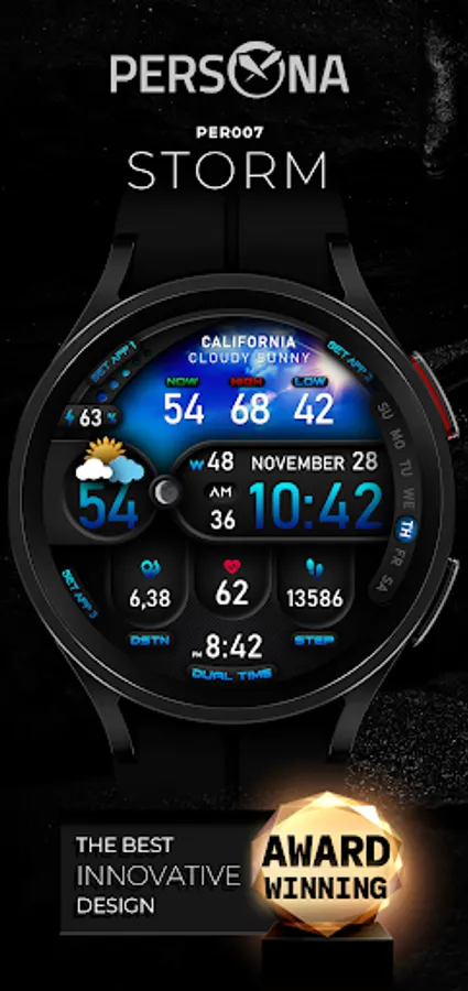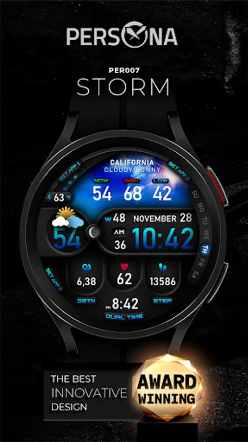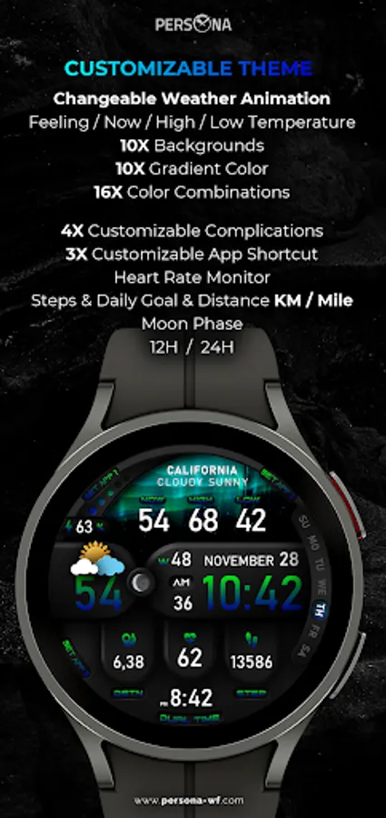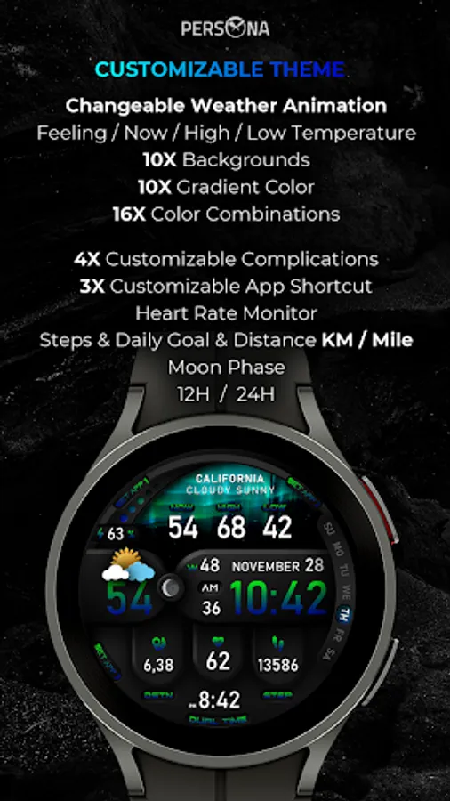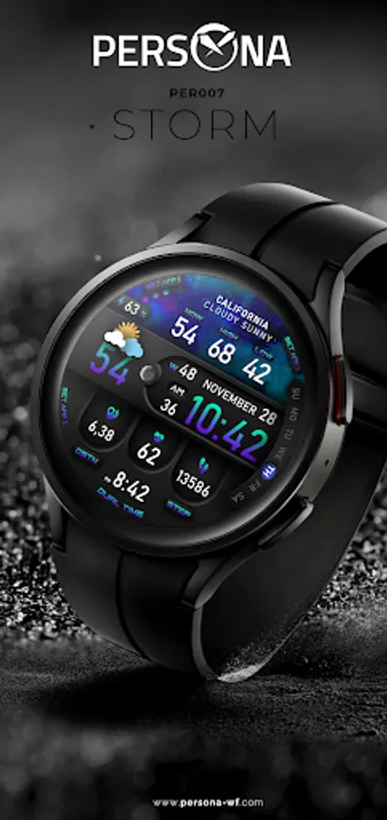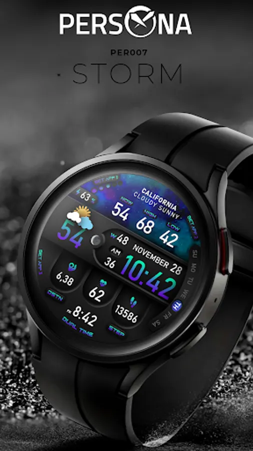 PER007 - Storm contains changeable weather animation, 10X backgrounds, 10X gradient colors, 16X color combinations, 4X customizable complications, 3X customizable app shortcut, heart rate, steps & daily goal & distance KM / Mile and more.
