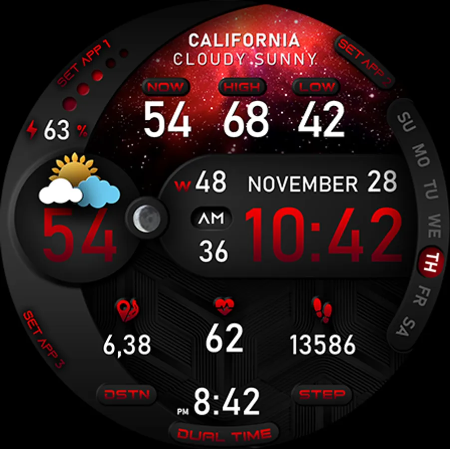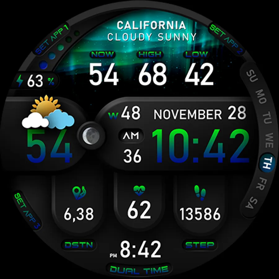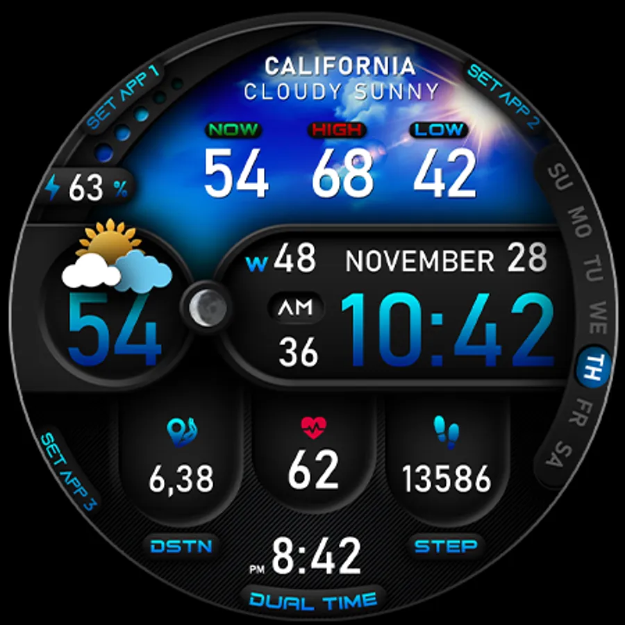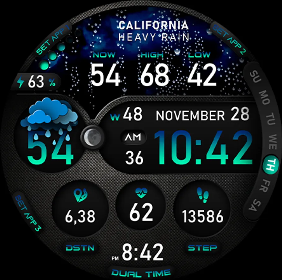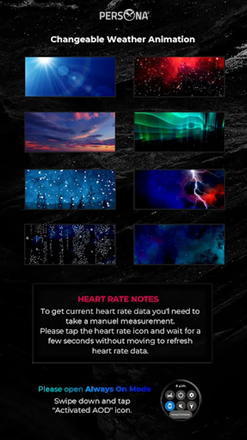 PER007 - Storm contains changeable weather animation, 10X backgrounds, 10X gradient colors, 16X color combinations, 4X customizable complications, 3X customizable app shortcut, heart rate, steps & daily goal & distance KM / Mile and more.