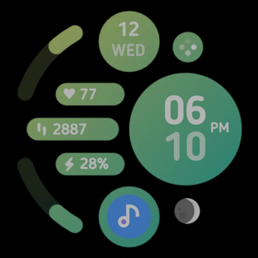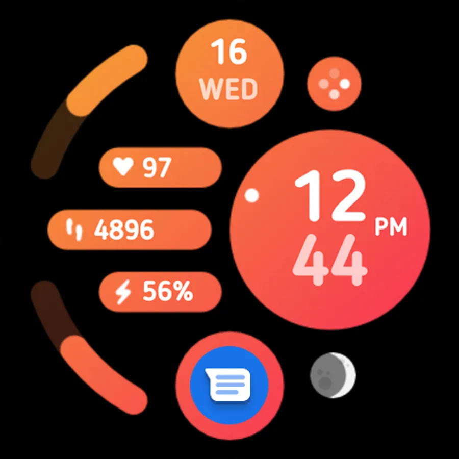 In the setting you can change the theme by choosing from 10 gradient styles. In addition to those already listed there are shortcuts to the calendar (accessible with a double tap on the date) and to the alarm app (accessible with a tap on the timetable). With a tap on the left side of the watch face you can update the heart rate value (it also update its self every 10 minutes). During the reading the heart icon flashes.