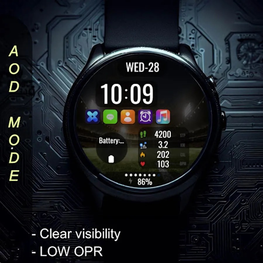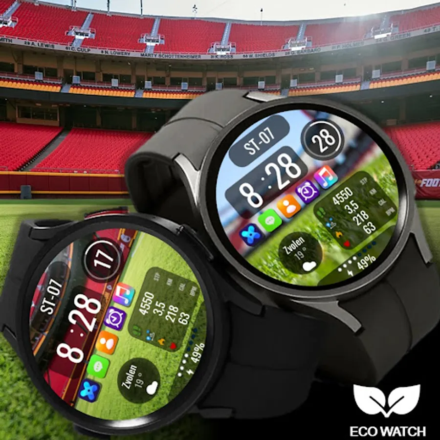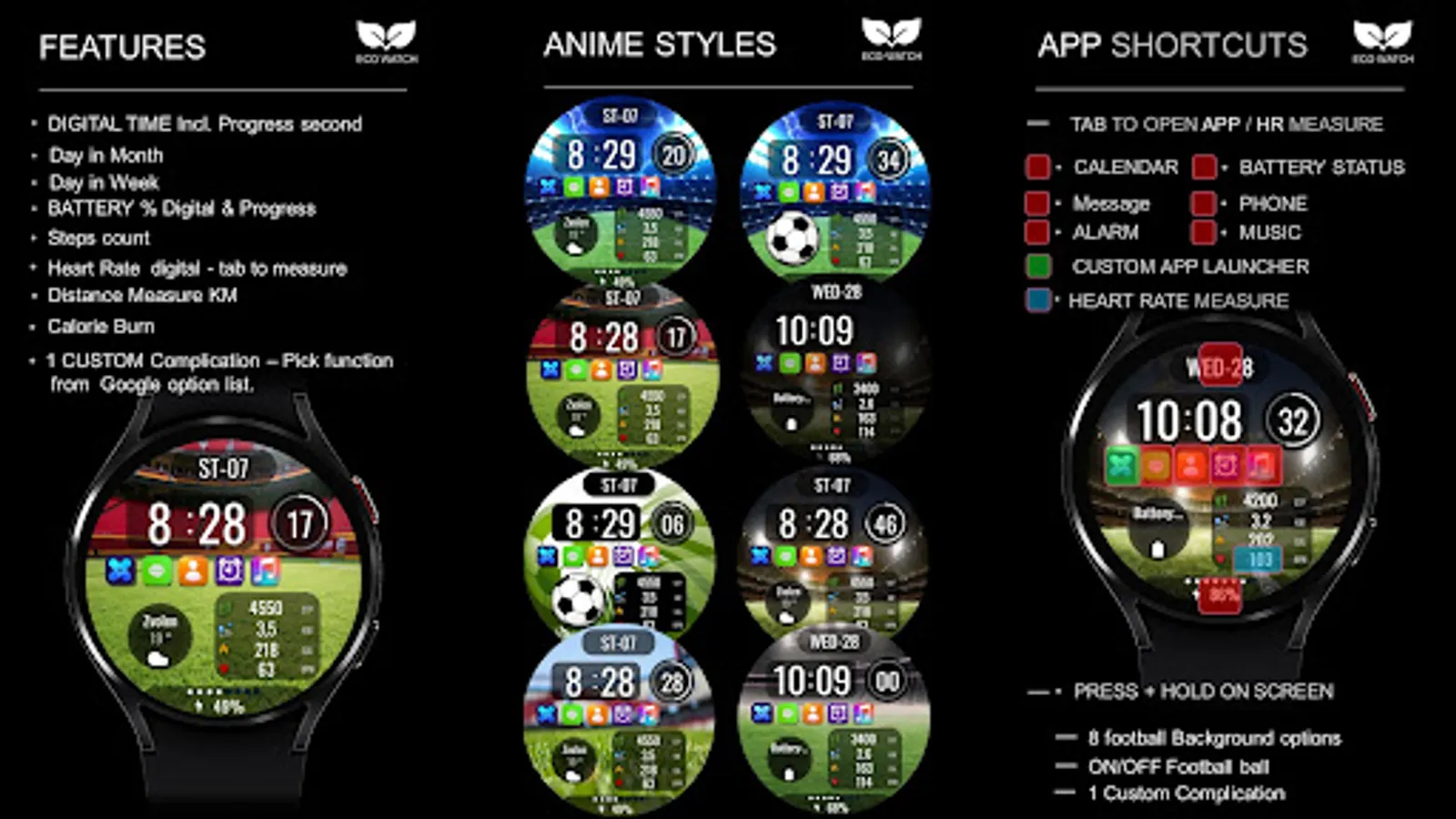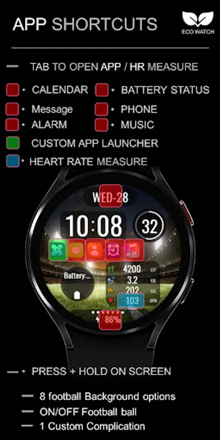 ⌚︎This Modular animated watch-face contains 8 football stadium background, ON/OFF football ball option.