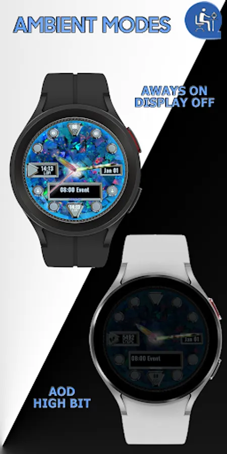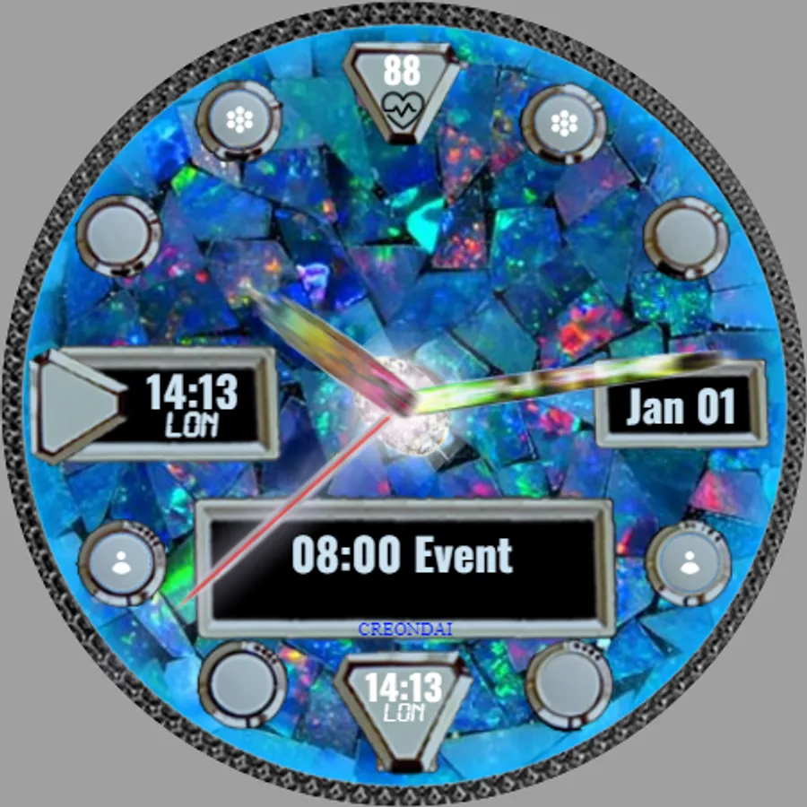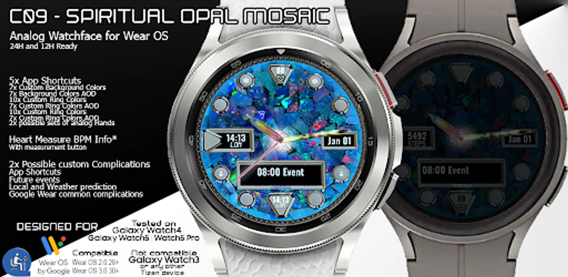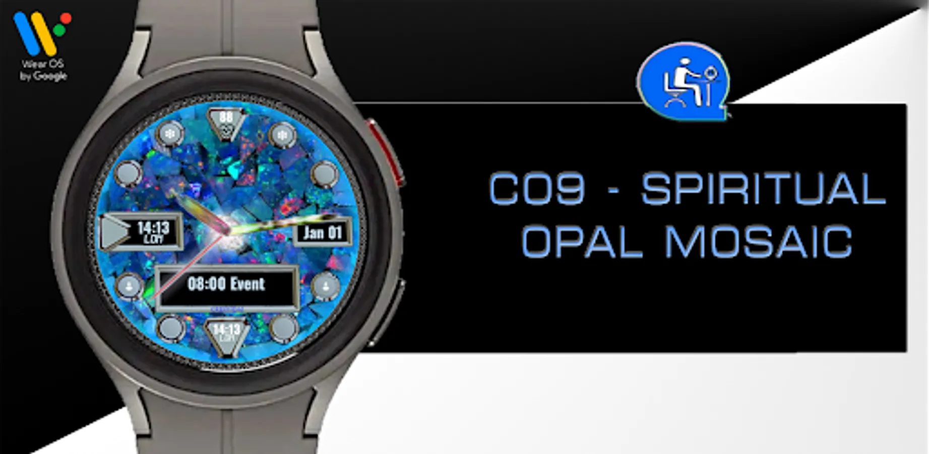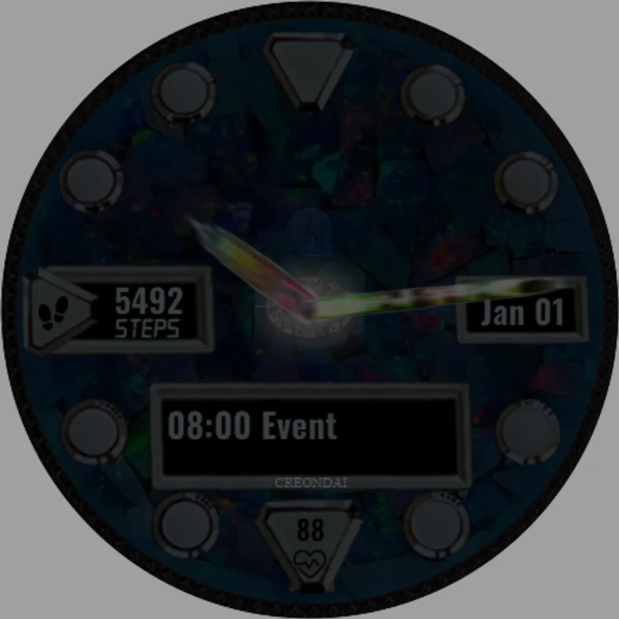 The Spiritual Opal Mosaic is a watchface for Wear OS by Creondai's Group. Inspired on old marble and mineral watches, it contains customizable shortcut, customizable complications, steps, heart rate, and more...