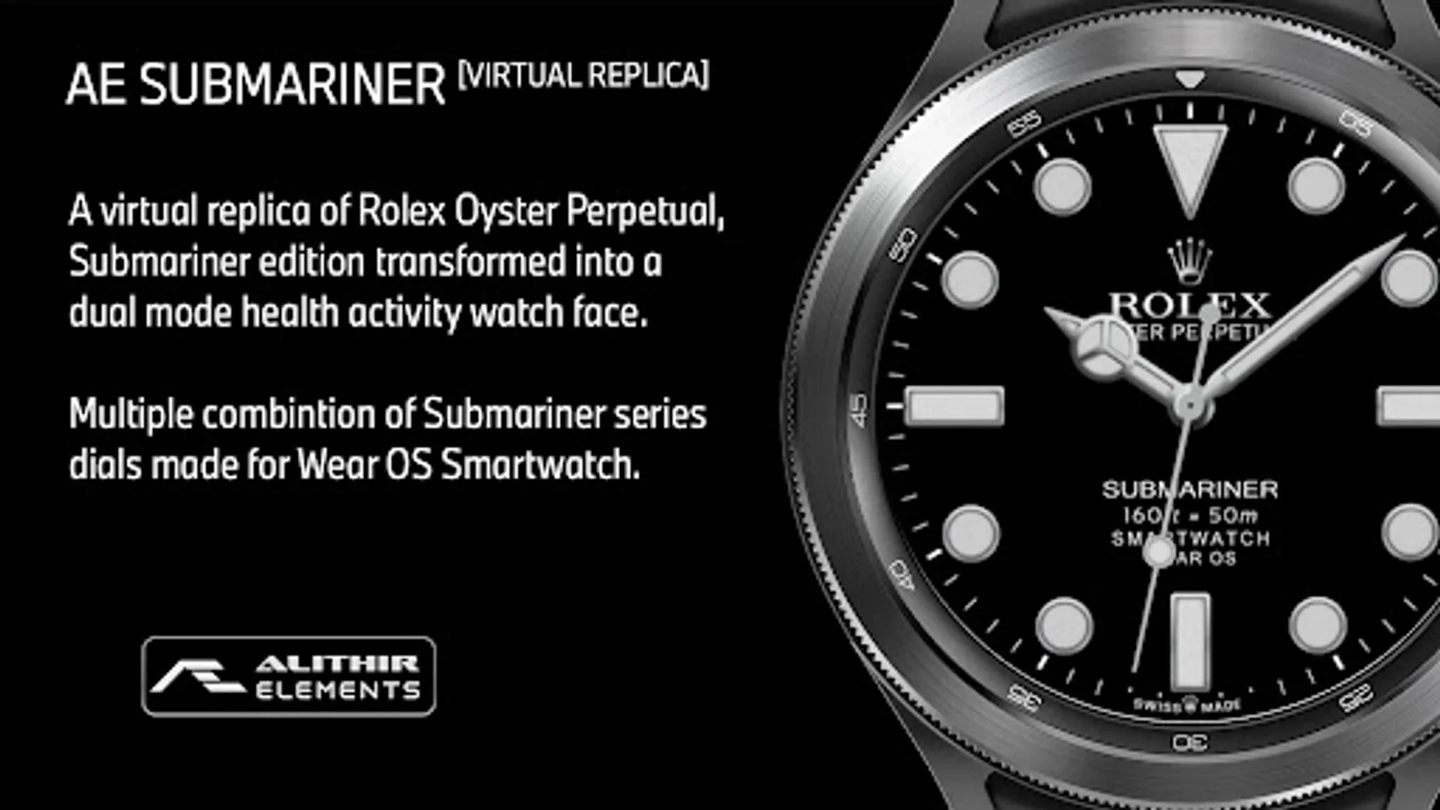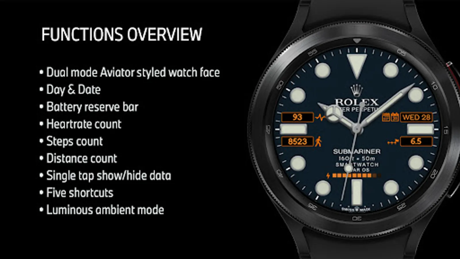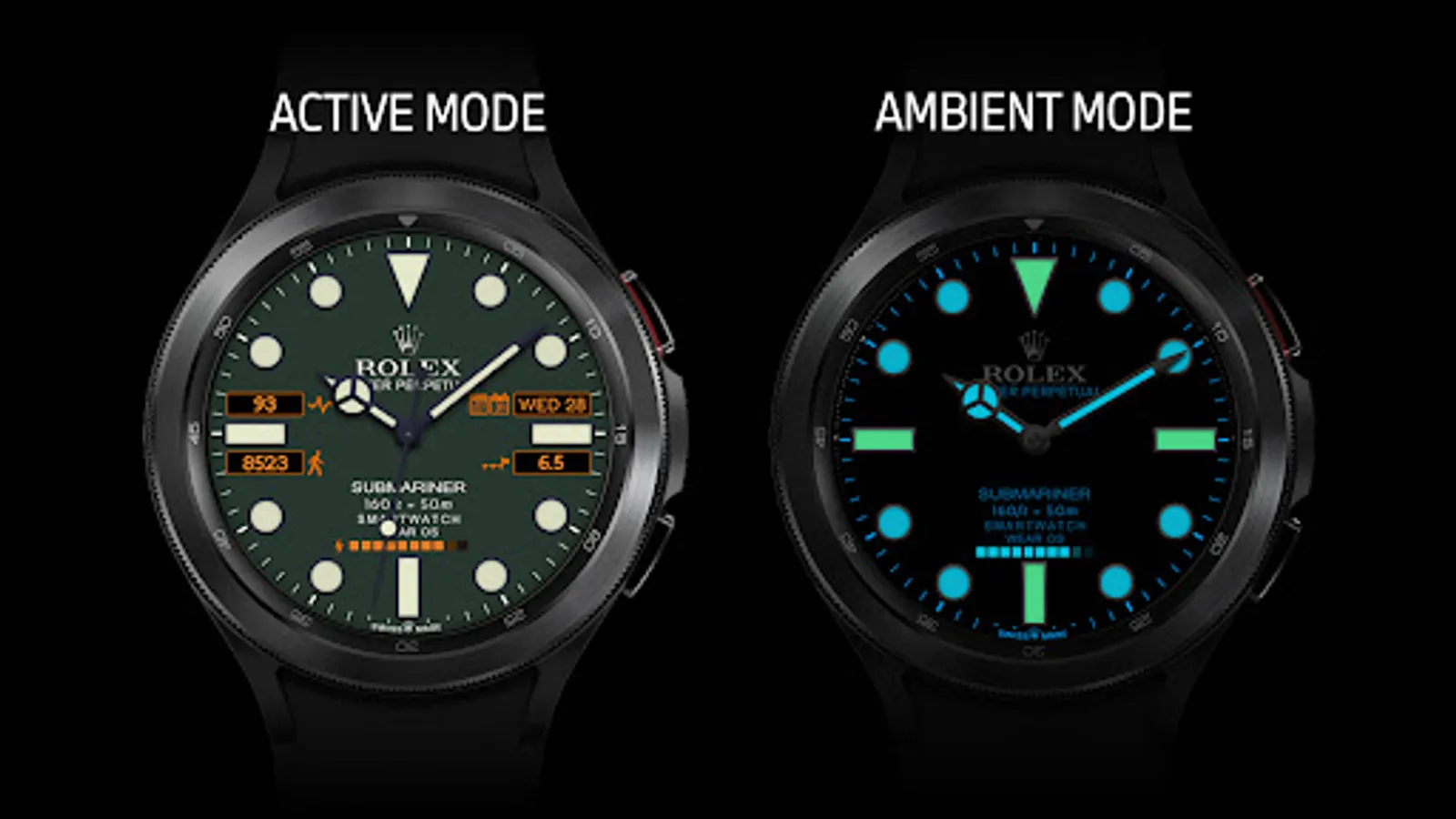 A smartwatch rendition of OYSTER PERPETUAL made for ROLEX enthusiasts. Dual mode field, health activity watch face with various combinations of SUBMARINER series renditions.