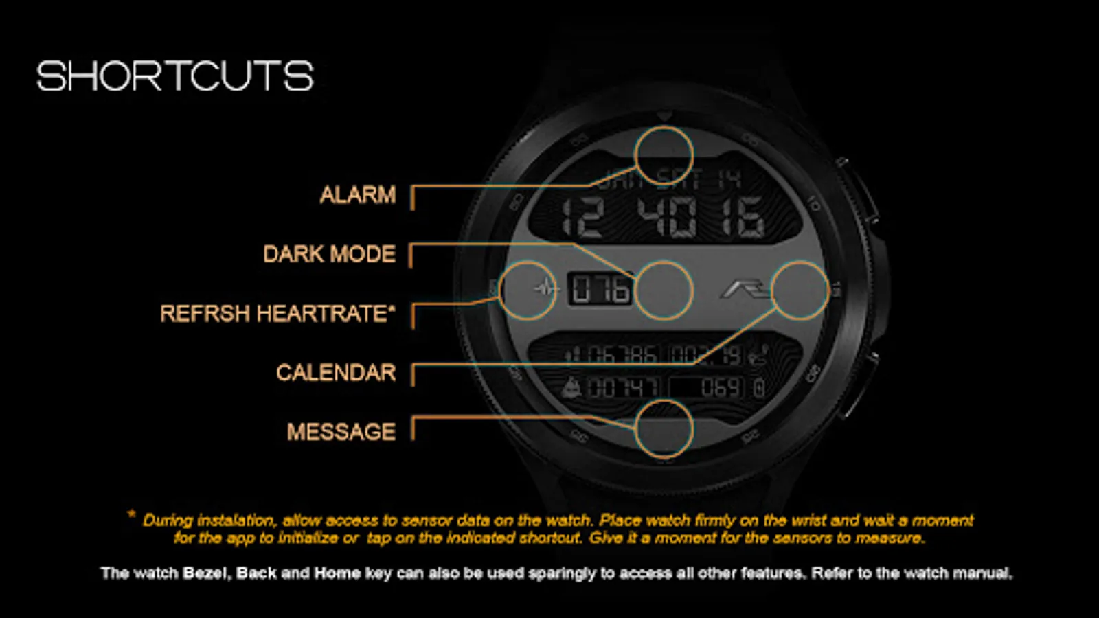 The refresh heartrate shortcut has been tested on Galaxy Watch 4 and Watch 4 Classic. During installation, allow access to sensor data on the watch. Place the watch firmly on the wrist and wait a moment for the app to initialize the heartrate or