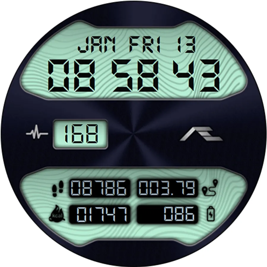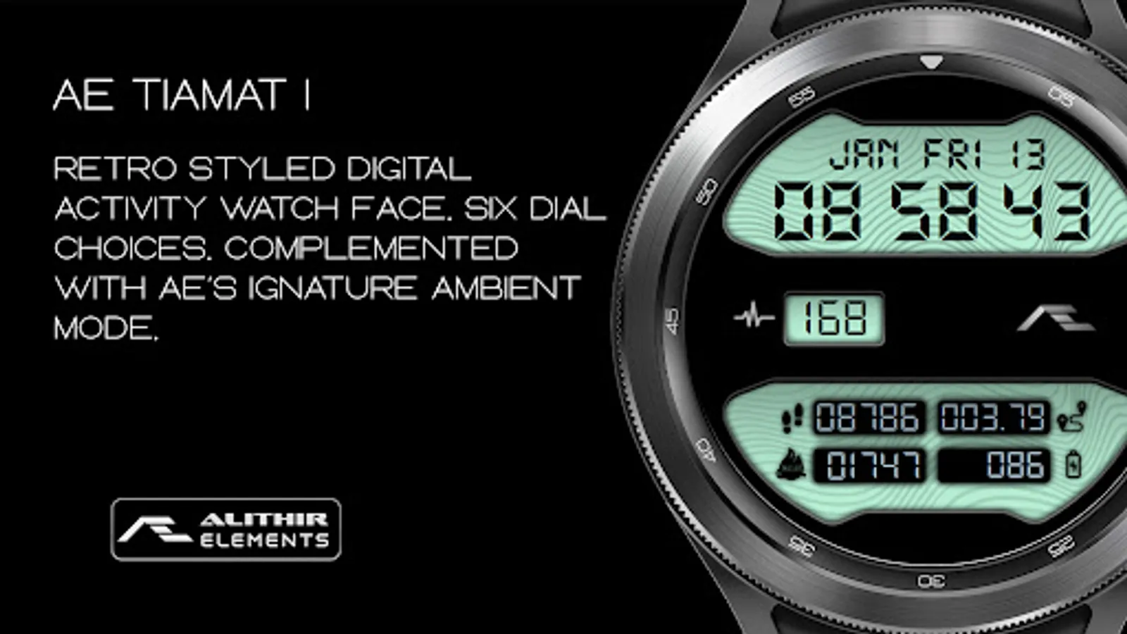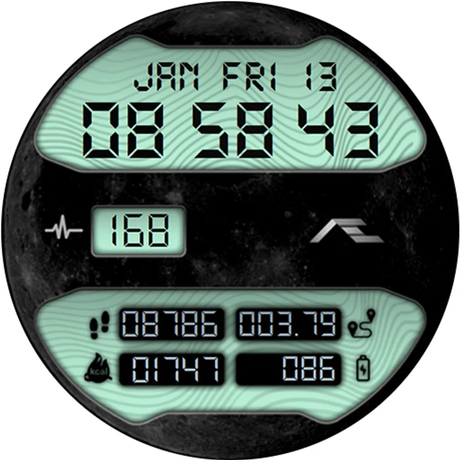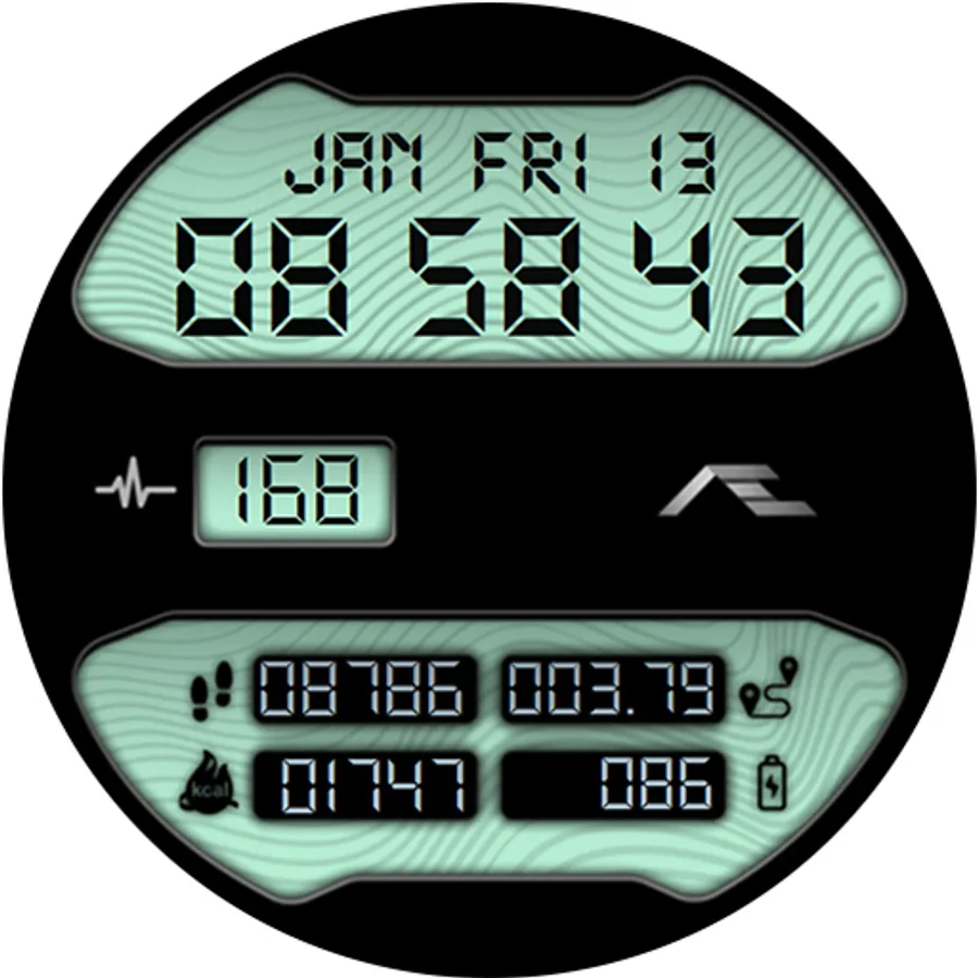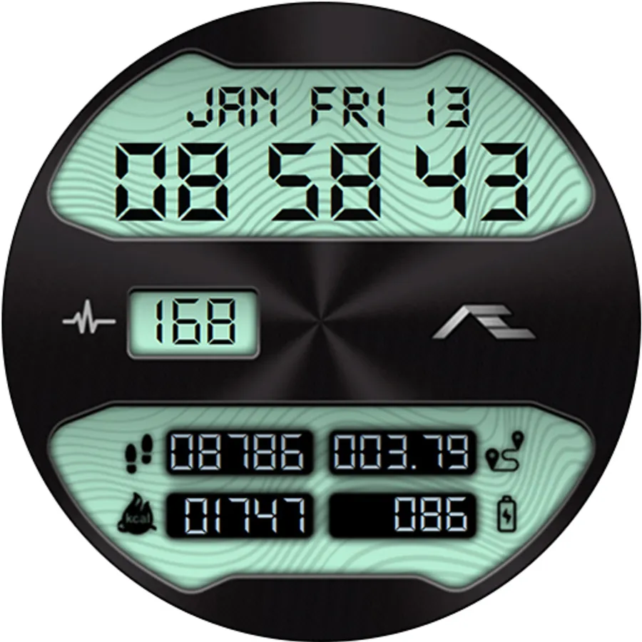 Retro styled digital health activity watch face made for the active. Six dial choices complemented with a cool Always ON Display.