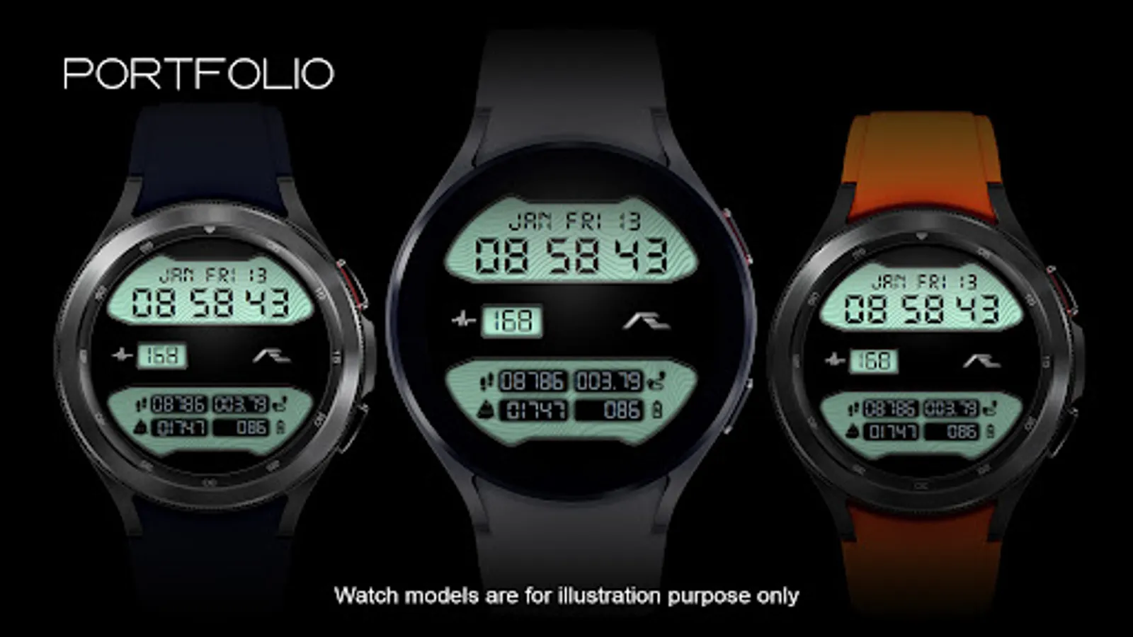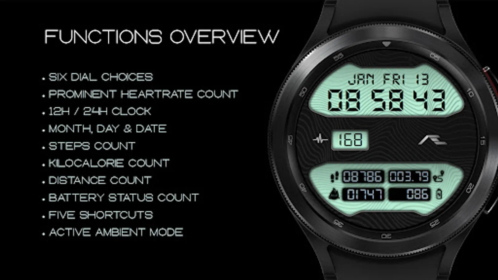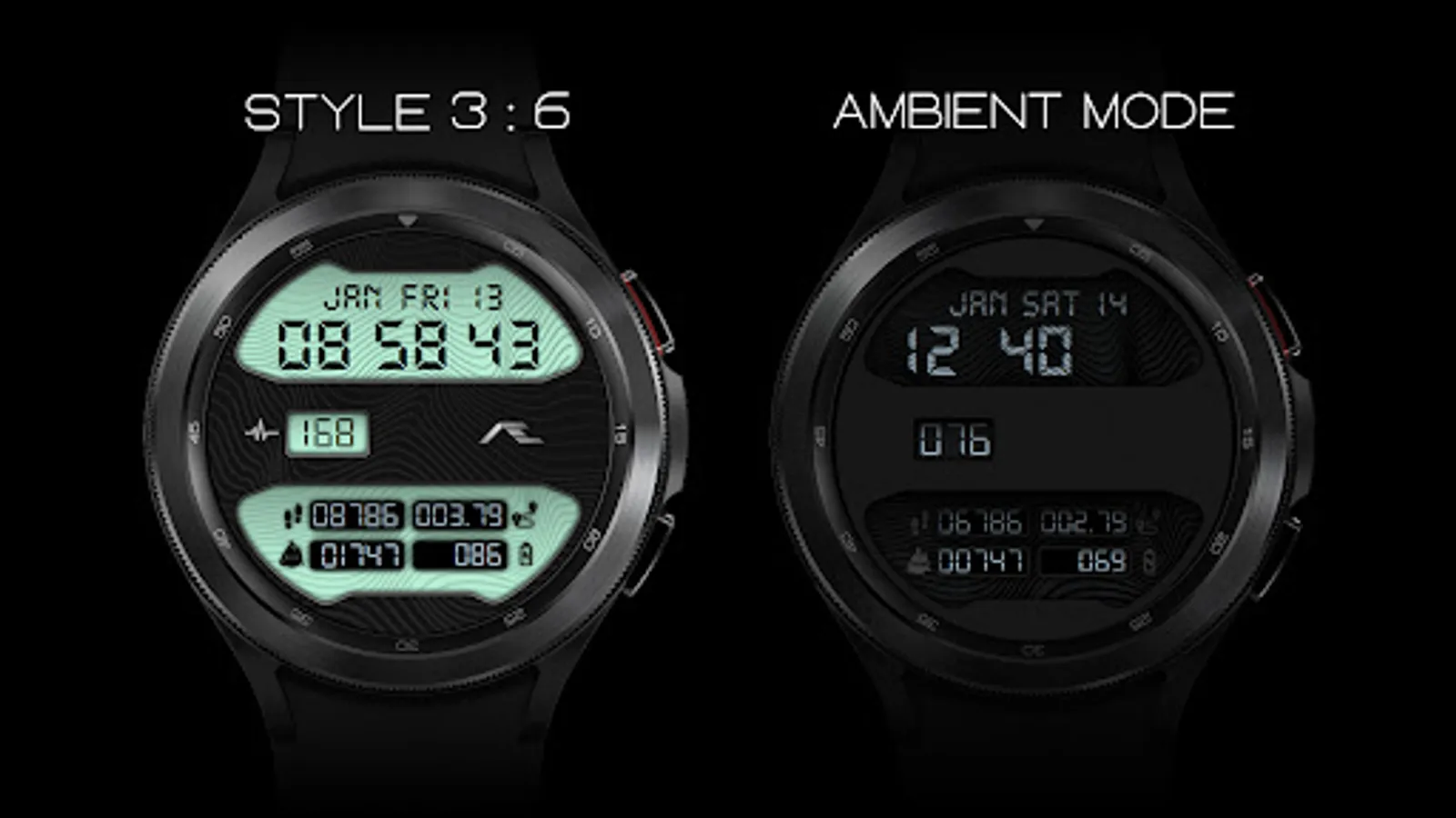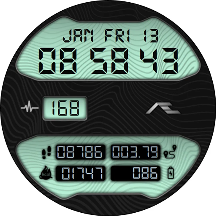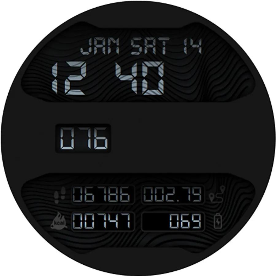 Retro styled digital health activity watch face made for the active. Six dial choices complemented with a cool Always ON Display.