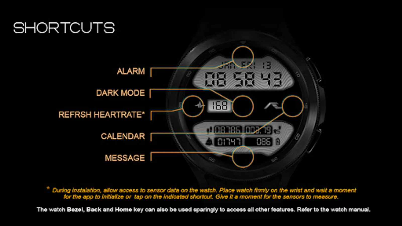 The refresh heartrate shortcut has been tested on Galaxy Watch 4 and Watch 4 Classic. During installation, allow access to sensor data on the watch. Place the watch firmly on the wrist and wait a moment for the app to initialize the heartrate or