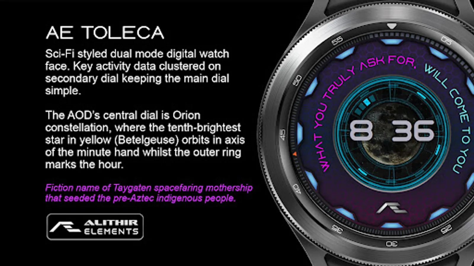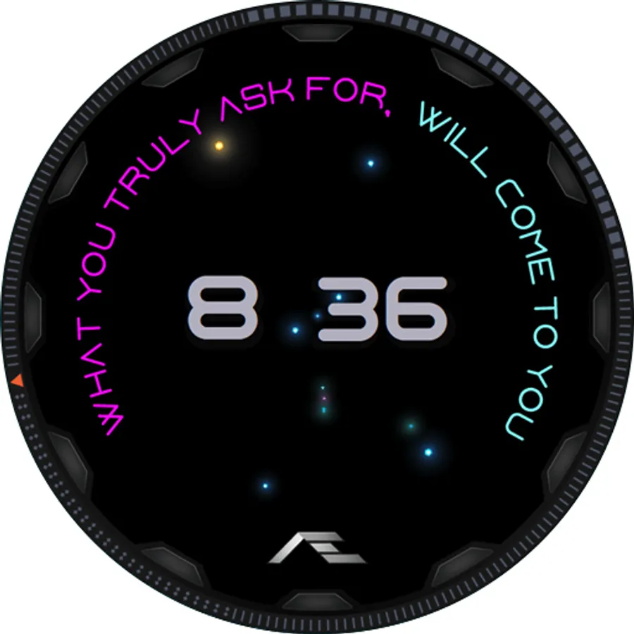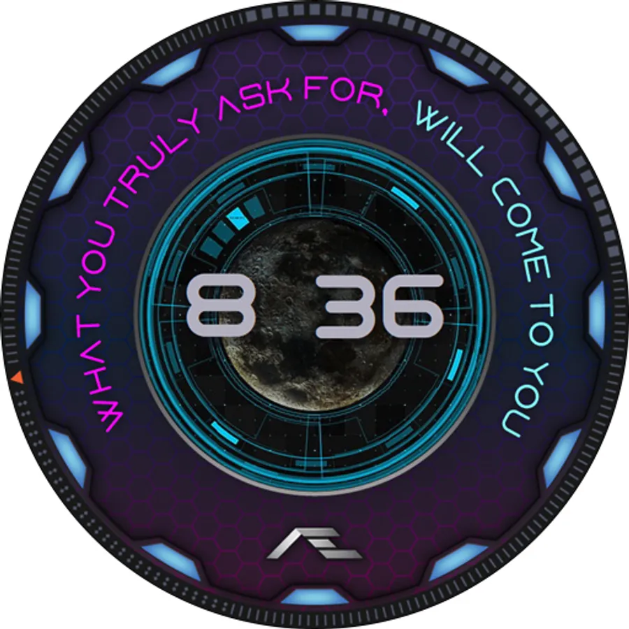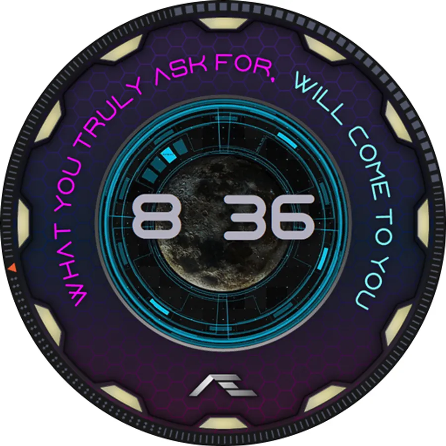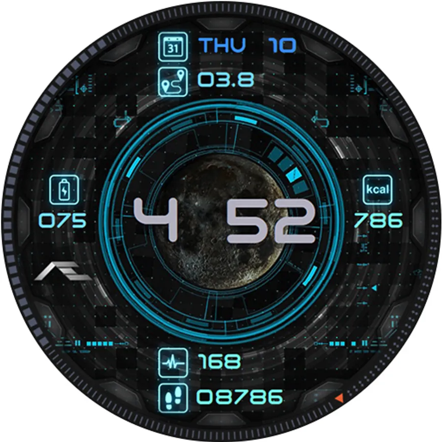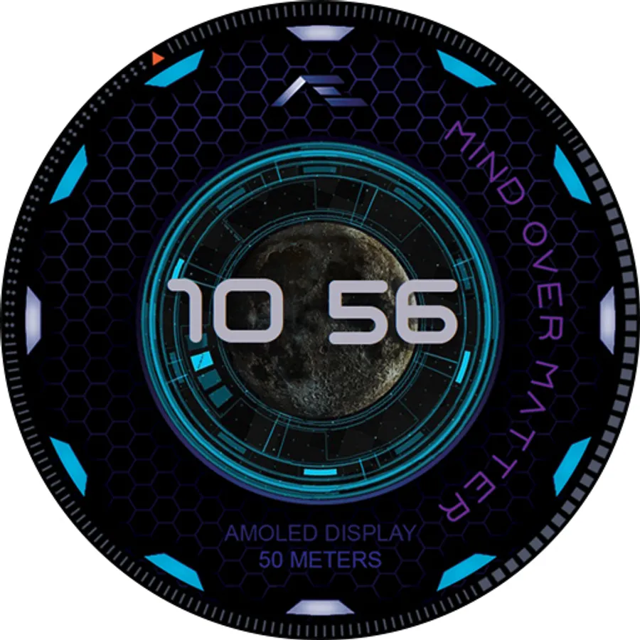 Sci-Fi styled dual mode digital watch face. A virtual view of the moon (and Orion constellation) from the cockpit of mothership. Key activity data clustered on secondary dial keeping the main dial simple with inspirational quote. The AOD’s central dial is Orion constellation, where the tenth-brightest star in yellow (Betelgeuse) orbits in axis of the minute hand whilst the outer ring marks the hour.
