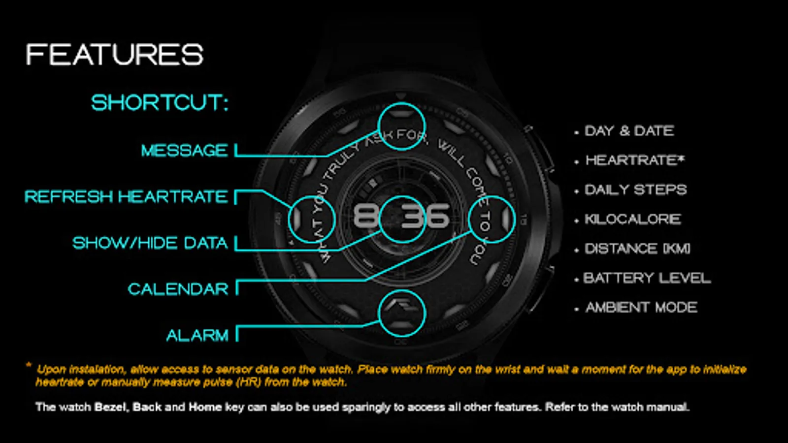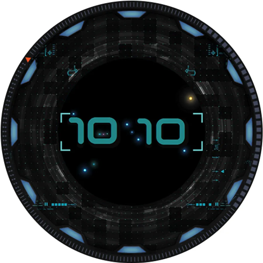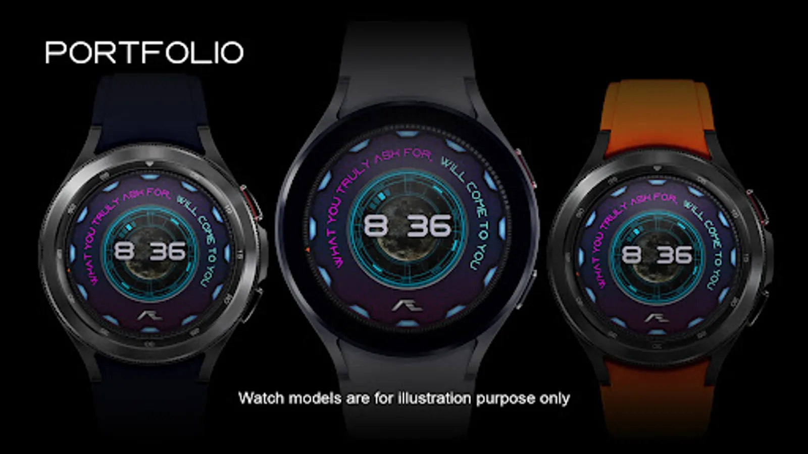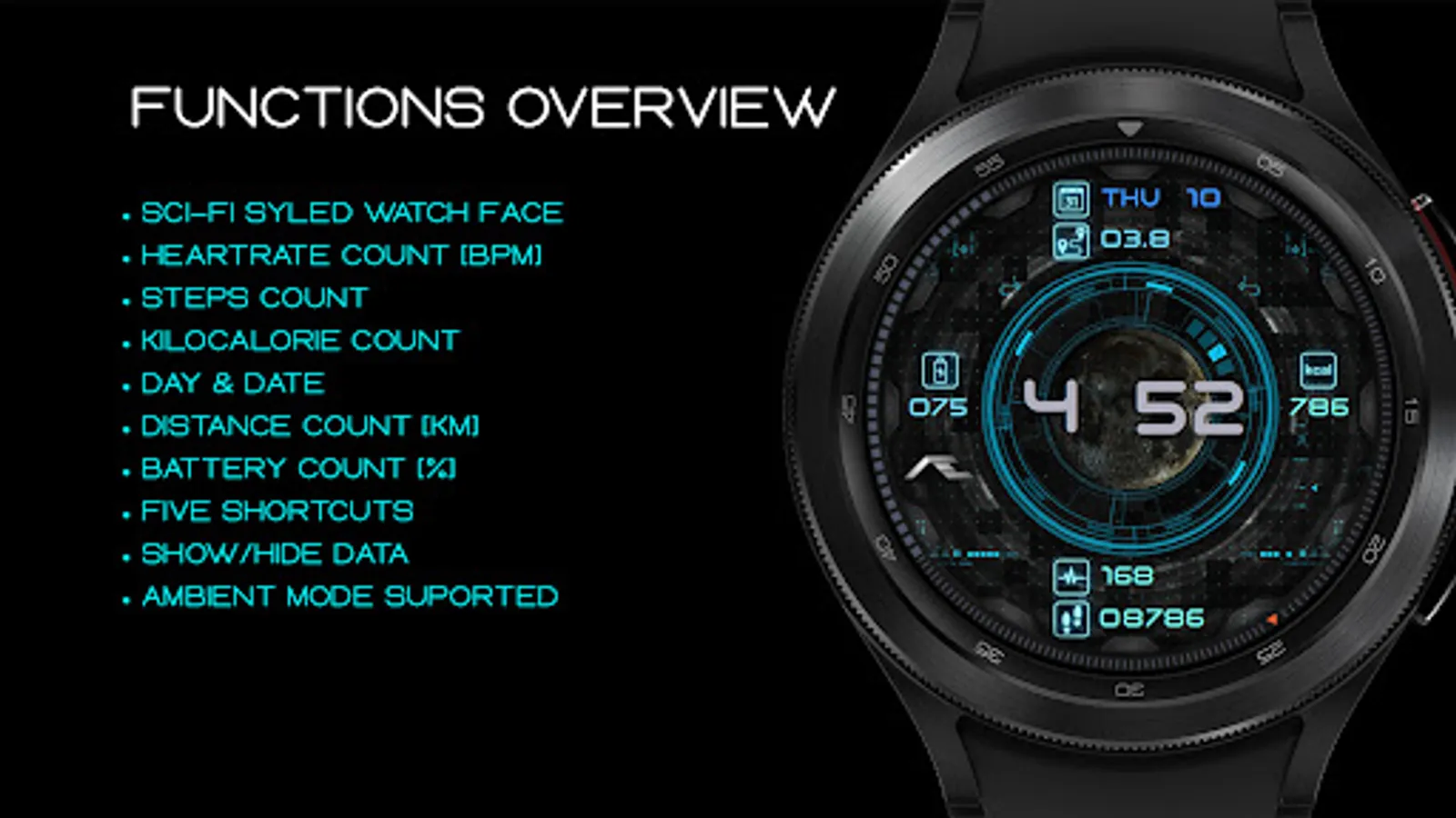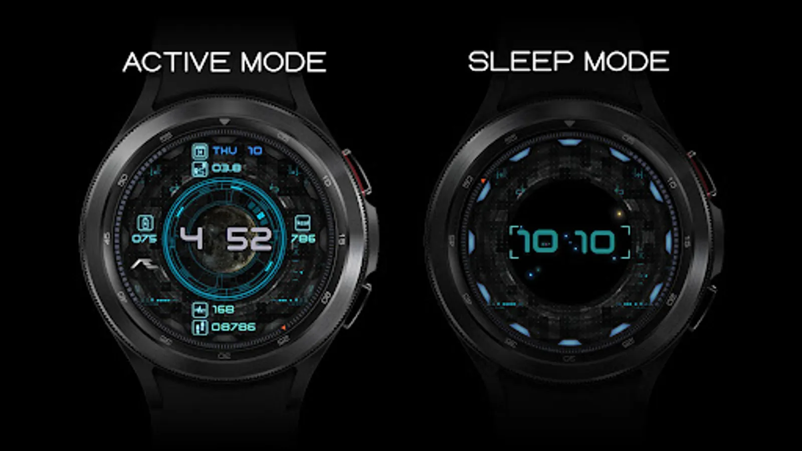 Sci-Fi styled dual mode digital watch face. A virtual view of the moon (and Orion constellation) from the cockpit of mothership. Key activity data clustered on secondary dial keeping the main dial simple with inspirational quote. The AOD’s central dial is Orion constellation, where the tenth-brightest star in yellow (Betelgeuse) orbits in axis of the minute hand whilst the outer ring marks the hour.