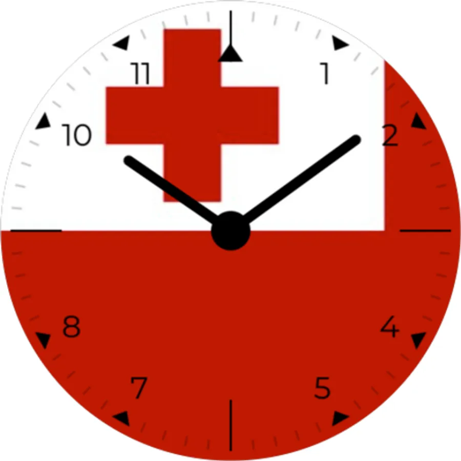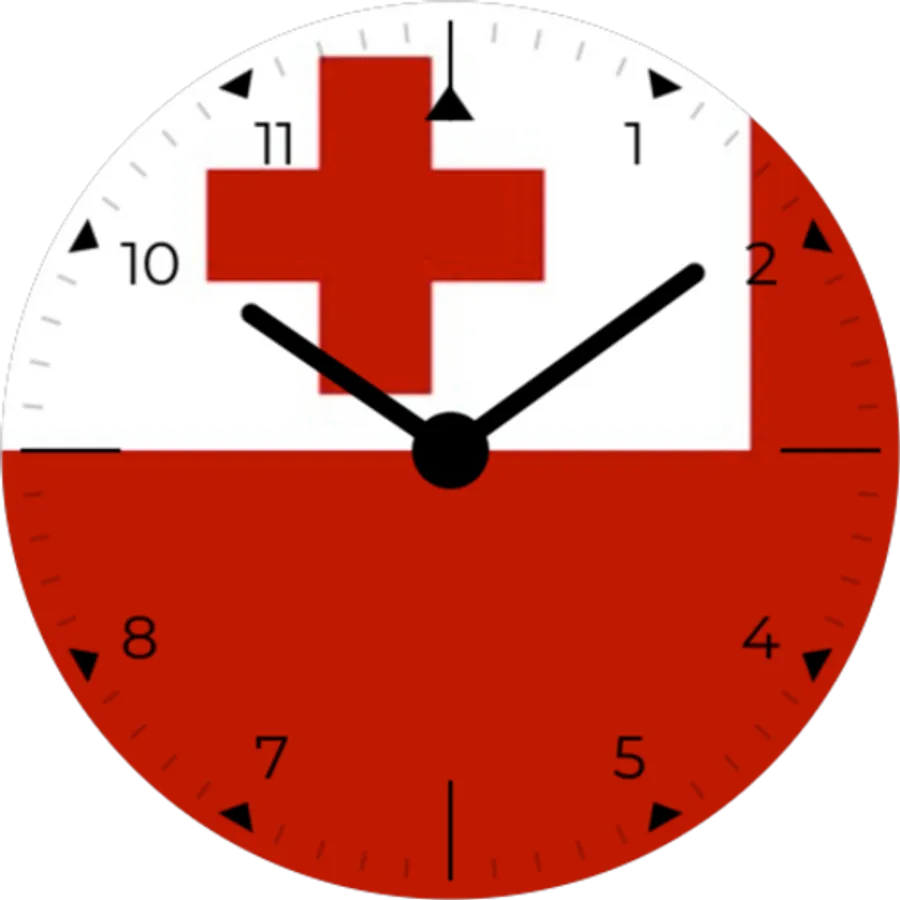 Analog watch face with Tonga flag in background. Show the pride in your nation with a sleek, modern watch face with your countries national flag. Always on display simple white on black for longer battery life.