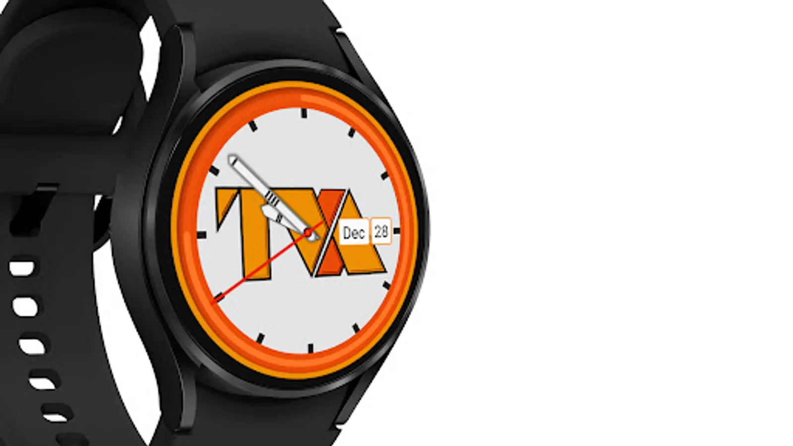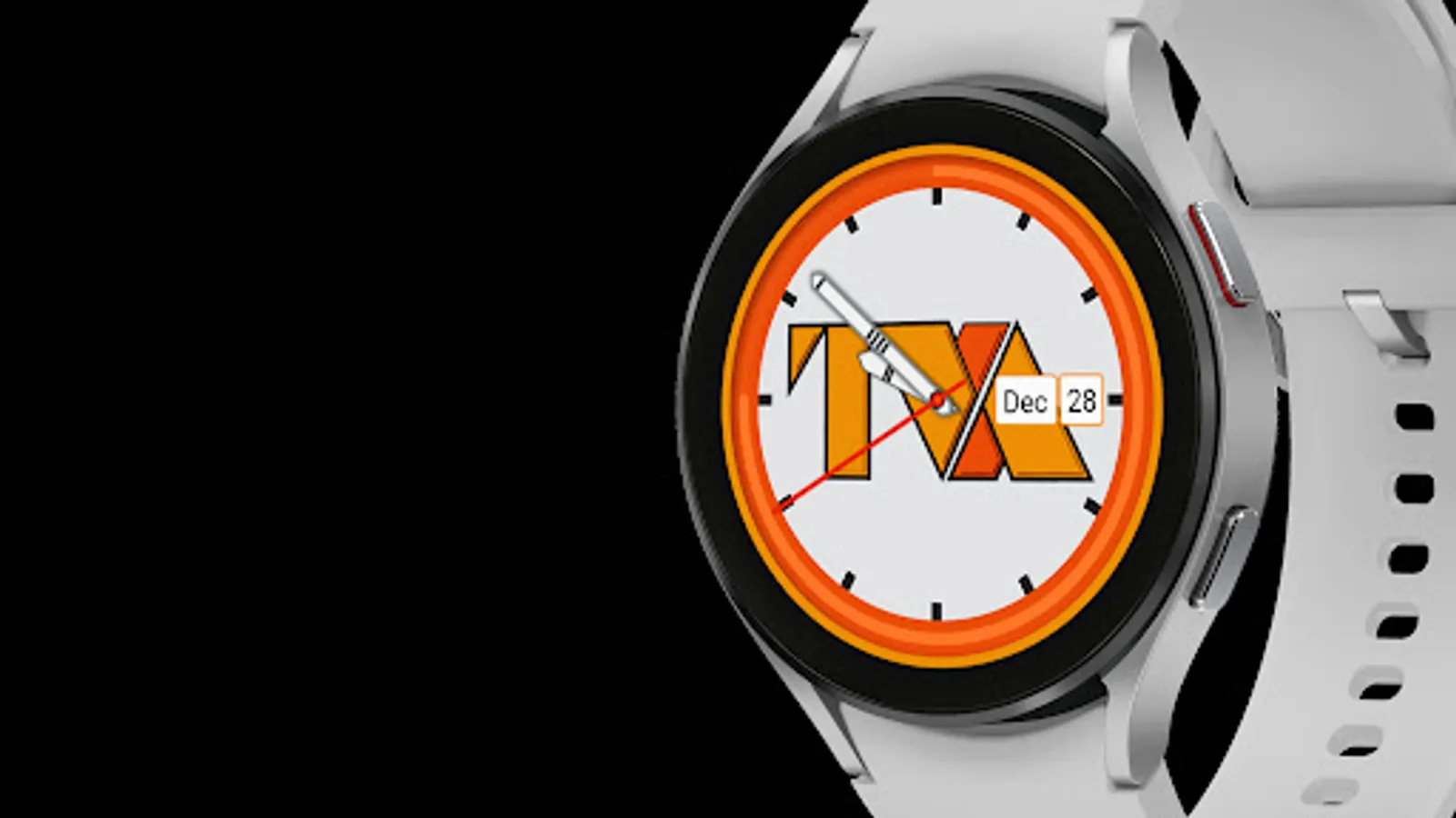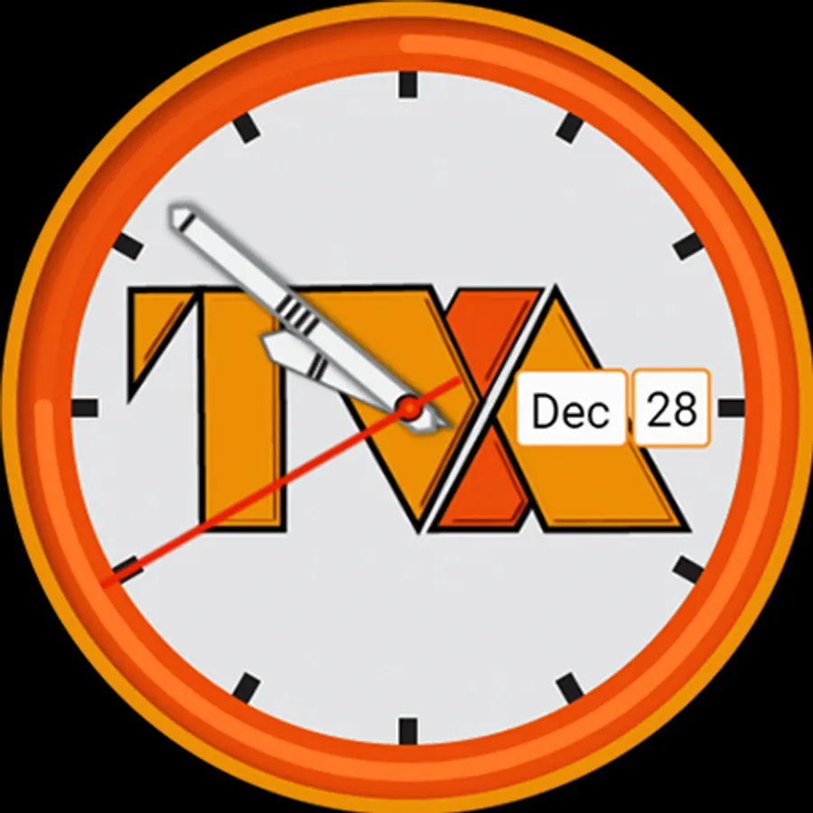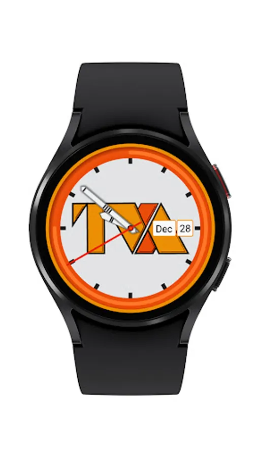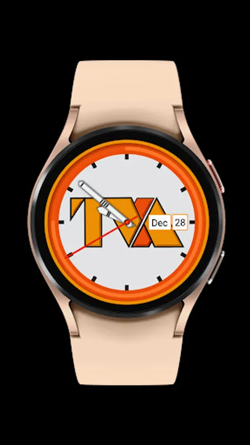 Analog watch with Short Month and Day of Month with a power remaining indicator in the form of an electric orange circular band.
