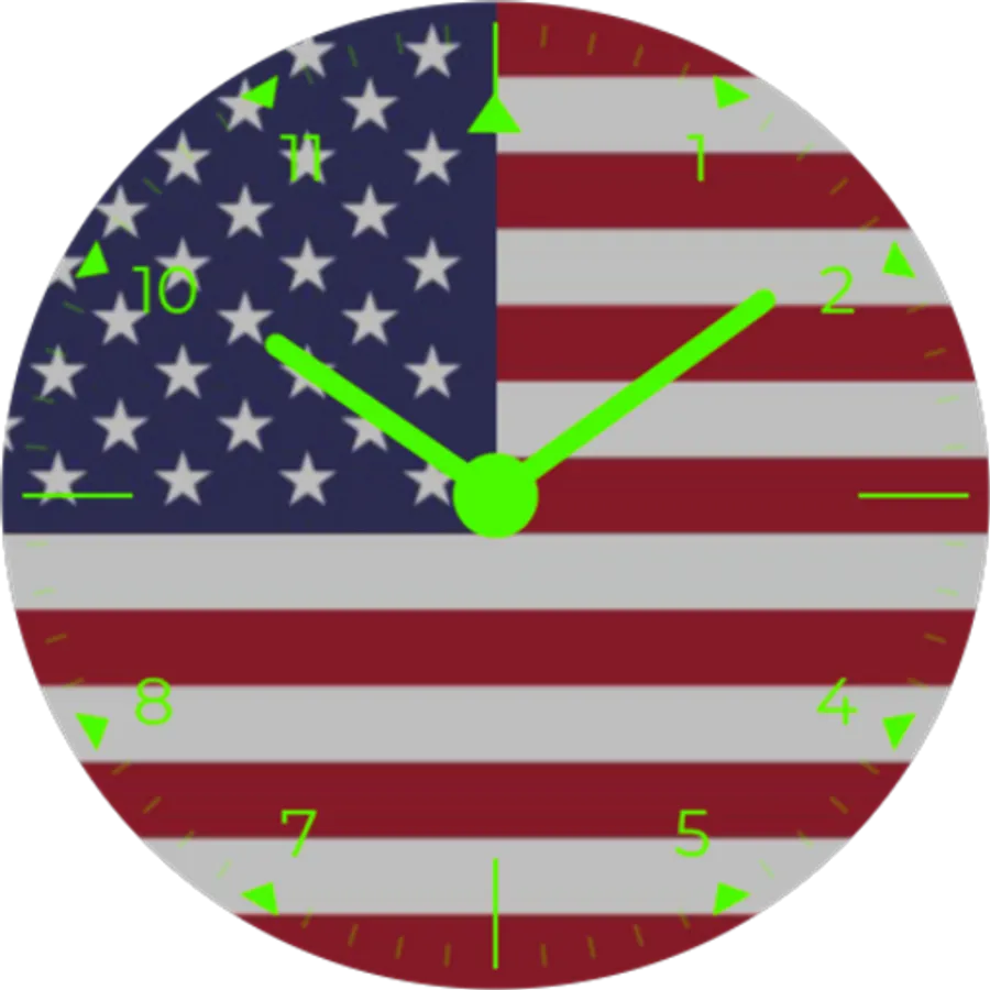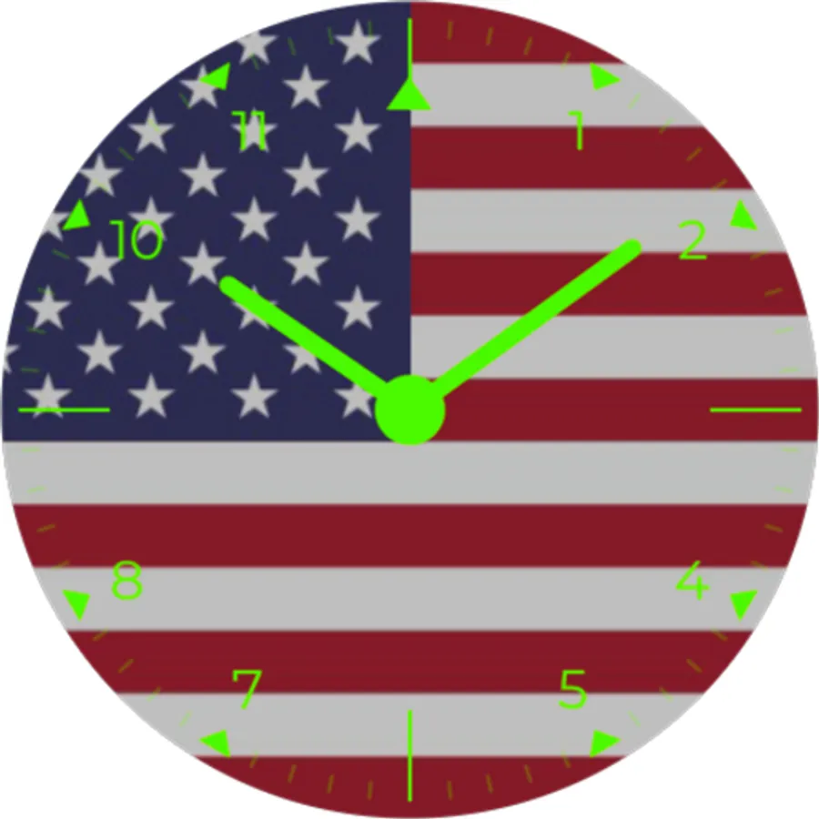 Analog watch face with United States flag in background. Show the pride in your nation with a sleek, modern watch face with your countries national flag. Always on display simple white on black for longer battery life.