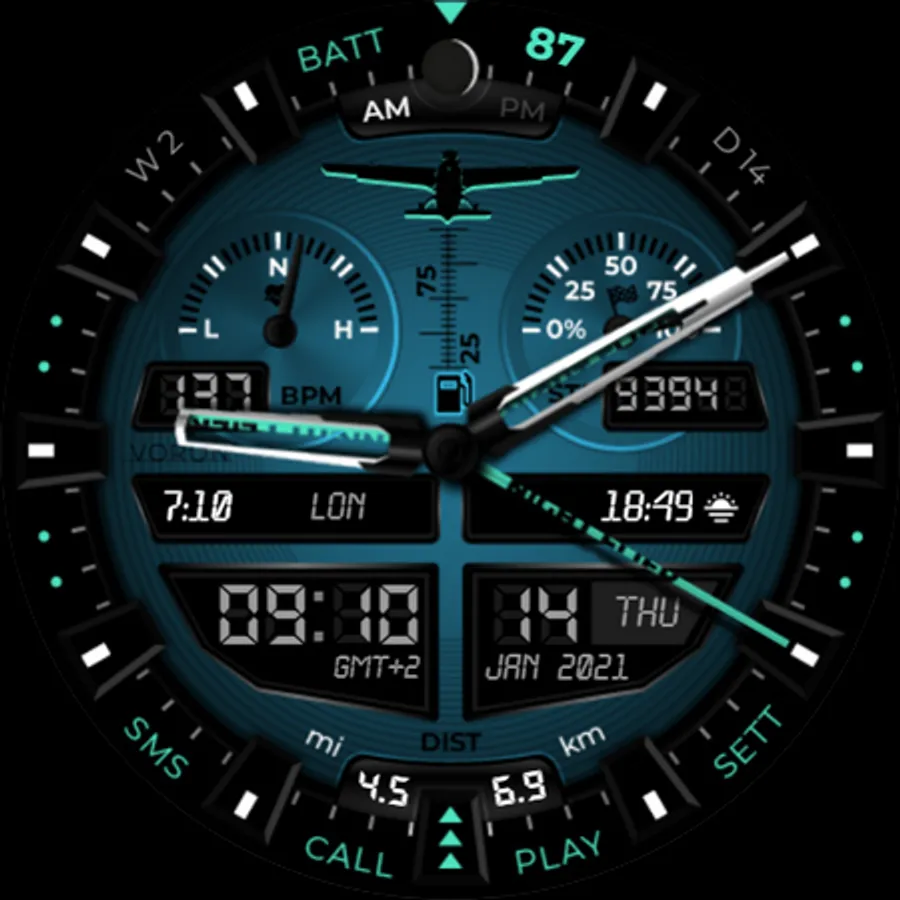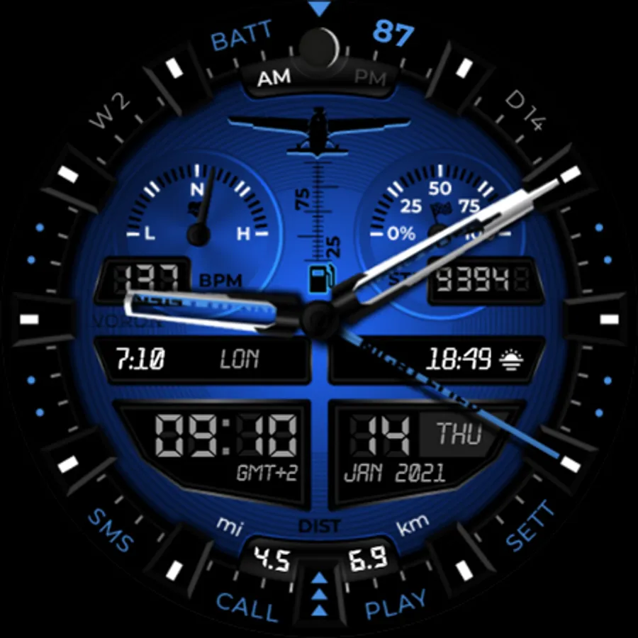 Do not chase the night flyer, he will find you himself. The plane will lose altitude when the battery of the smartwatch runs out. Hybrid informative watch face with the ability to customize to suit your mood.