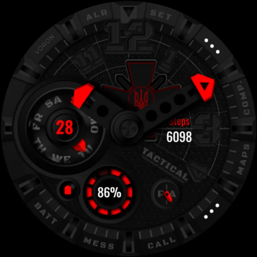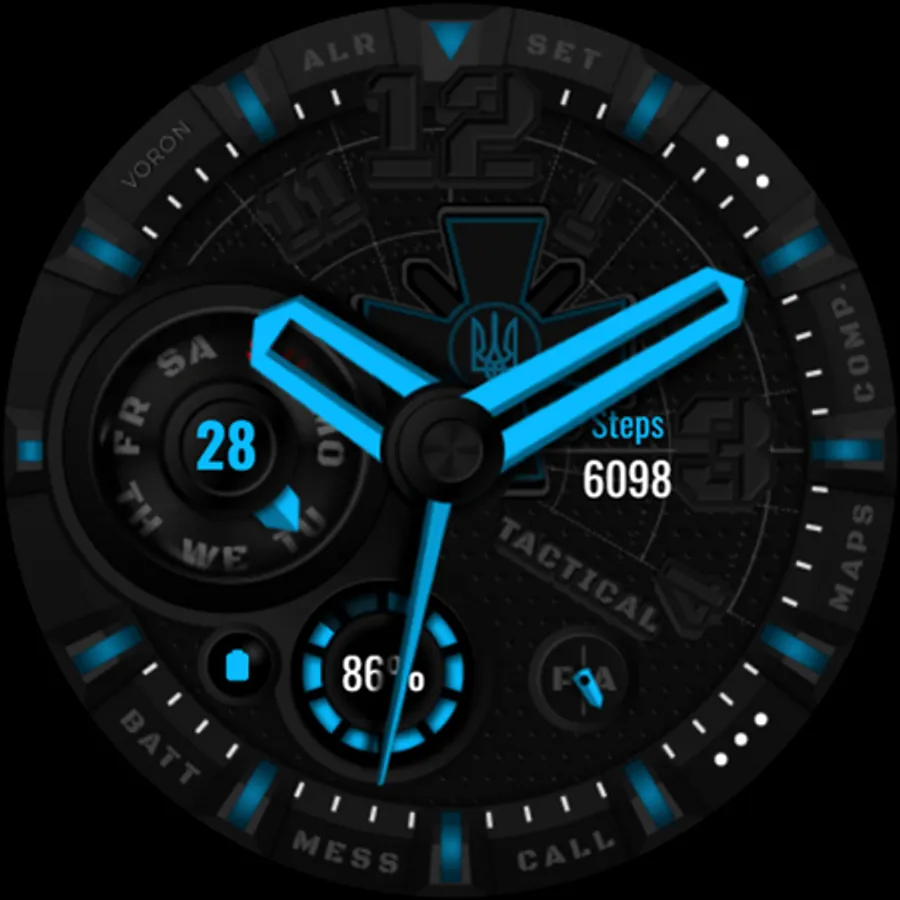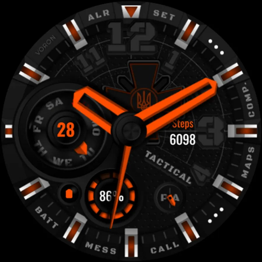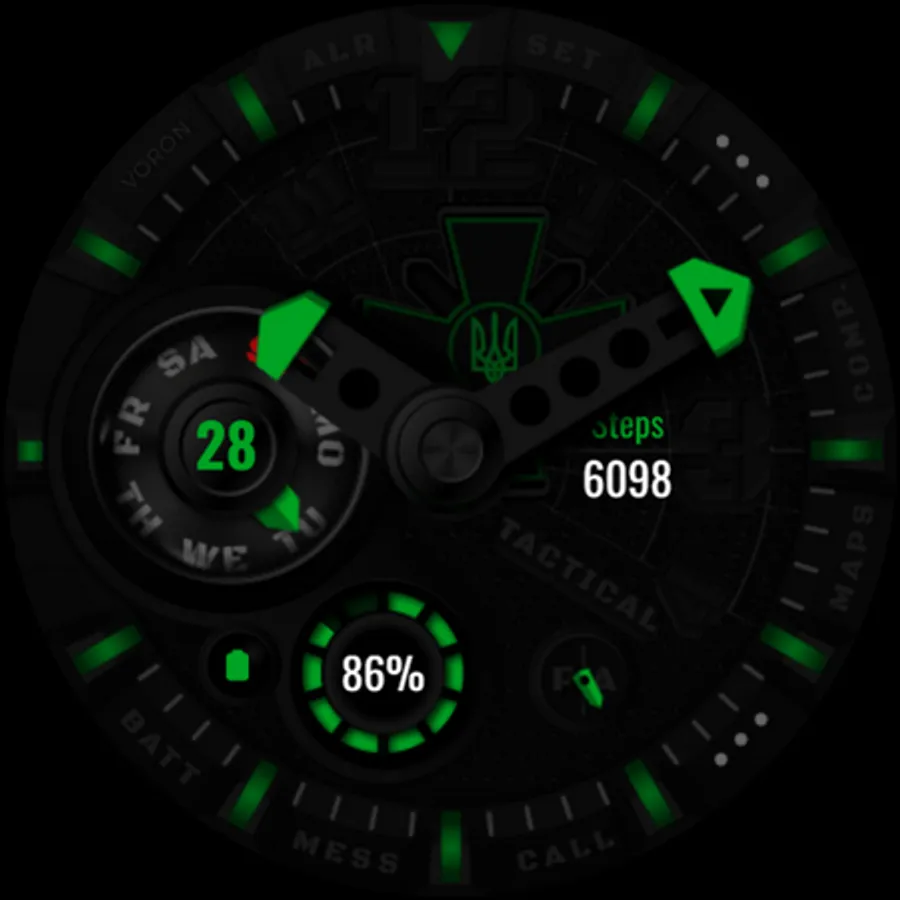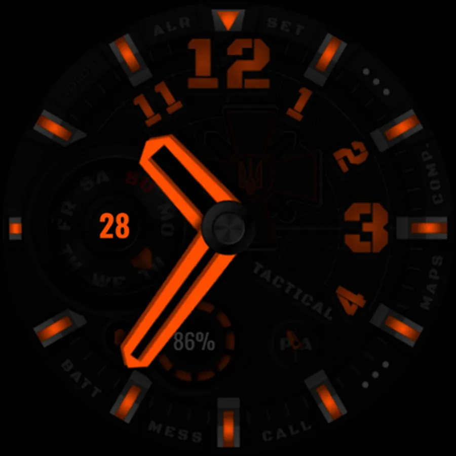 Tactical Ukrainian watchface with the coat of arms of the Ukrainian armed forces. There are different settings for dimming the elements of the watchface for the best battery usage. On the "Maps" and "Comp" (Compass) shortcuts, configure your compass and map applications, for quick access, that are supported by your device. Watch face about the Ukrainian theme.