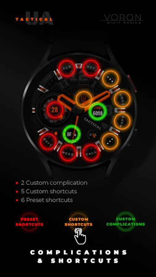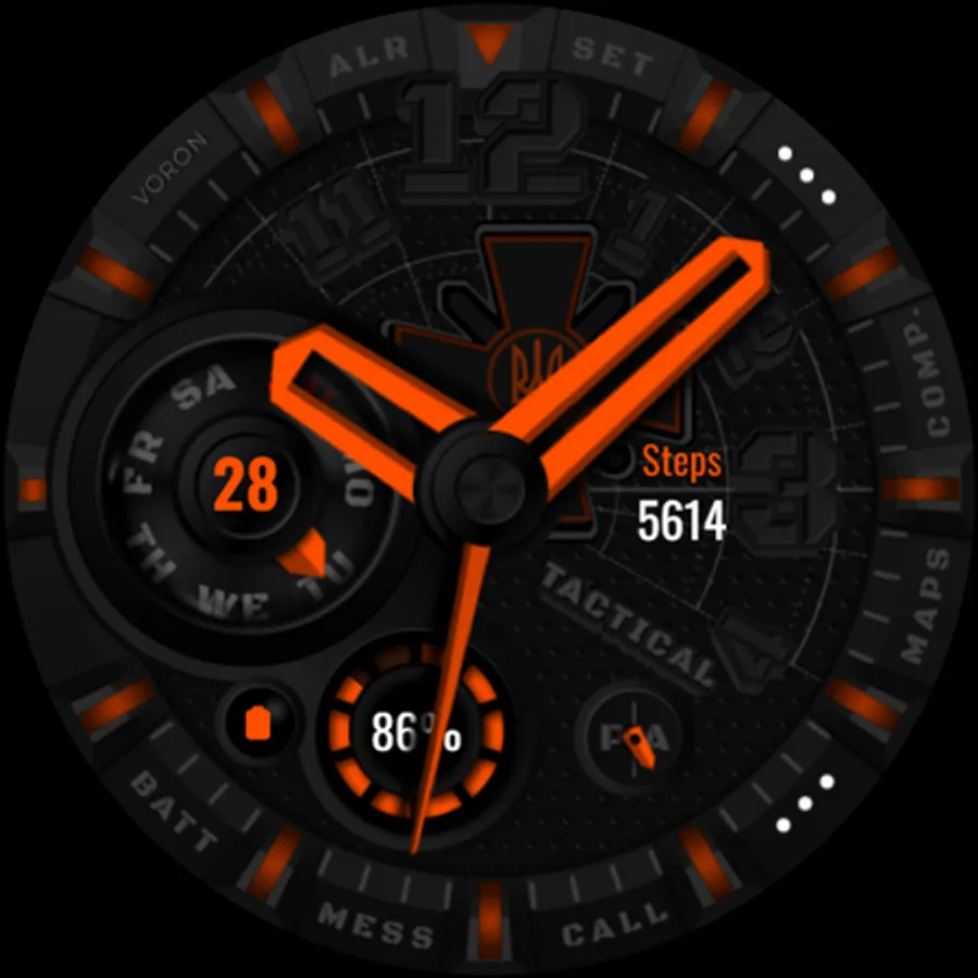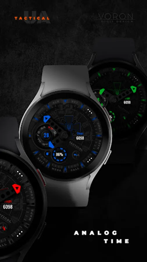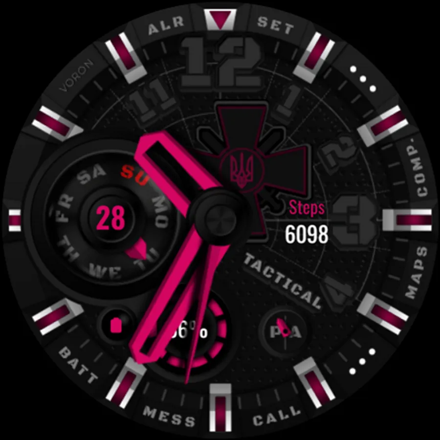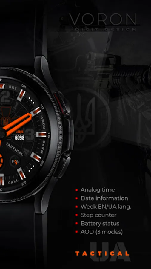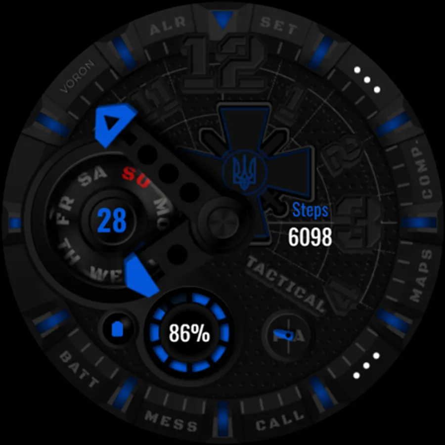 Tactical Ukrainian watchface with the coat of arms of the Ukrainian armed forces. There are different settings for dimming the elements of the watchface for the best battery usage. On the "Maps" and "Comp" (Compass) shortcuts, configure your compass and map applications, for quick access, that are supported by your device. Watch face about the Ukrainian theme.