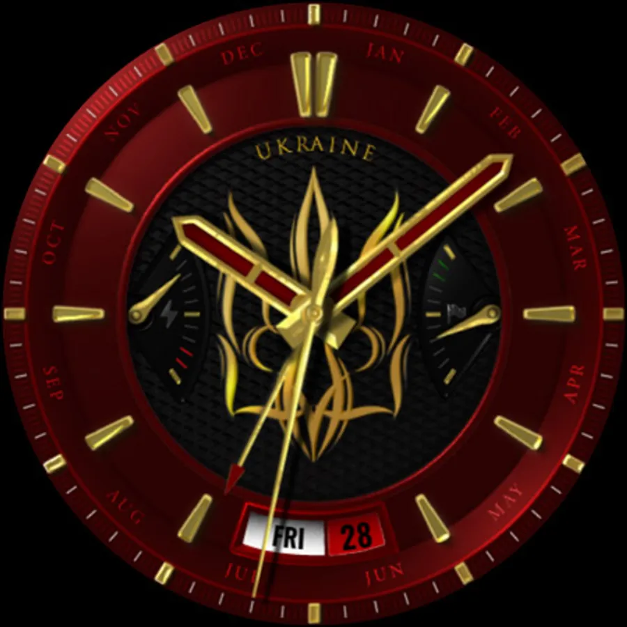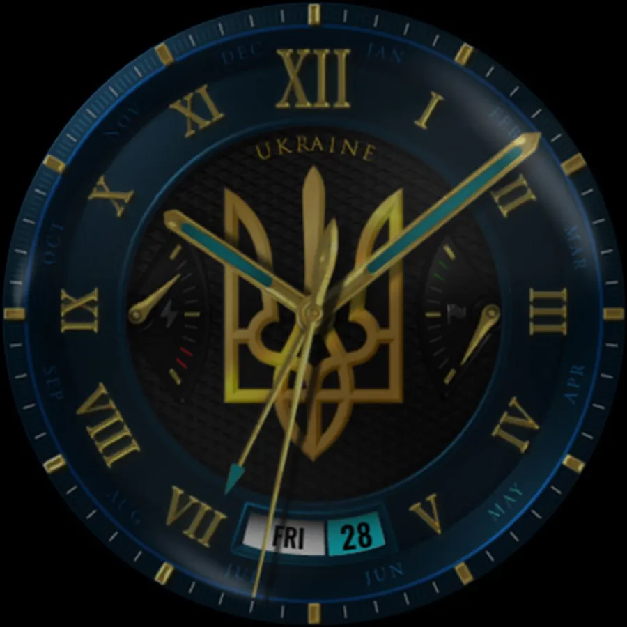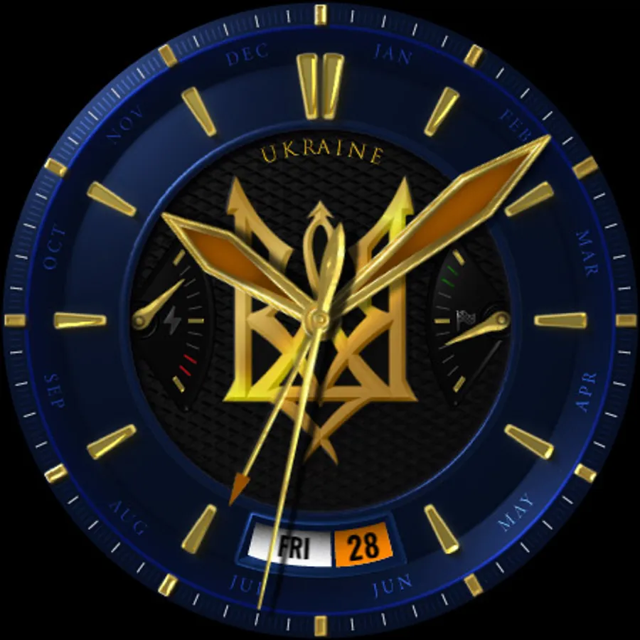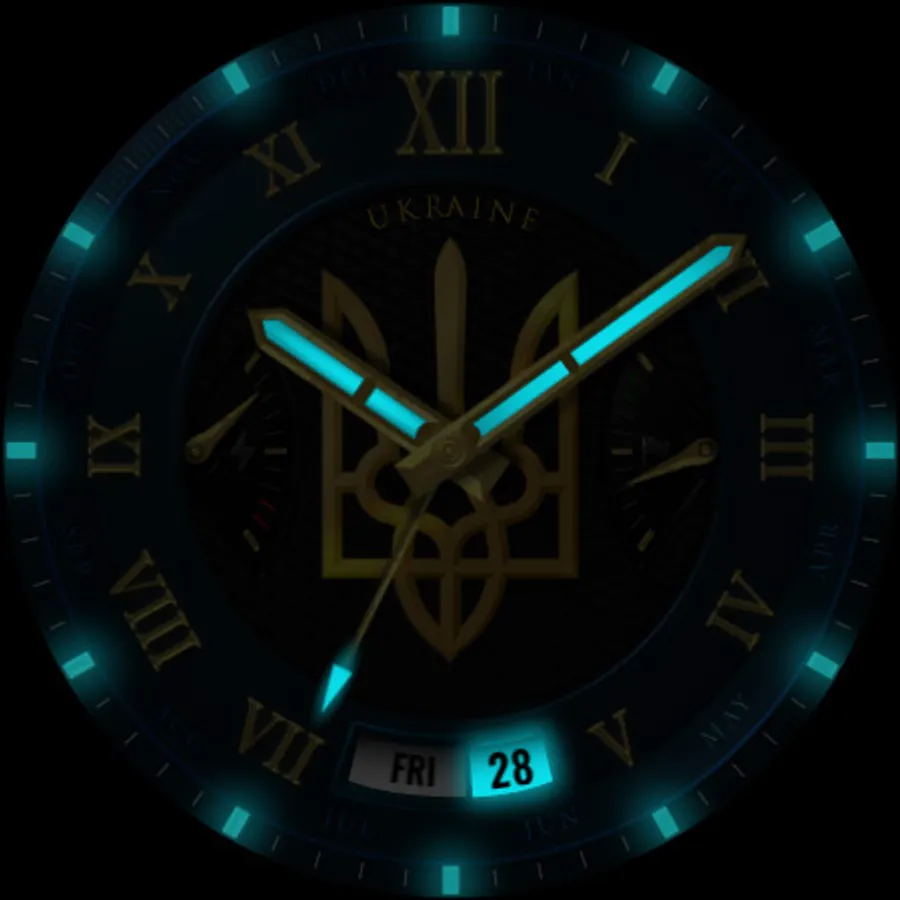 Customizable realistic analog watch face with coat of arms of Ukraine in different styles. Different backlight colors, time indicators and watch face hand styles for personalization.