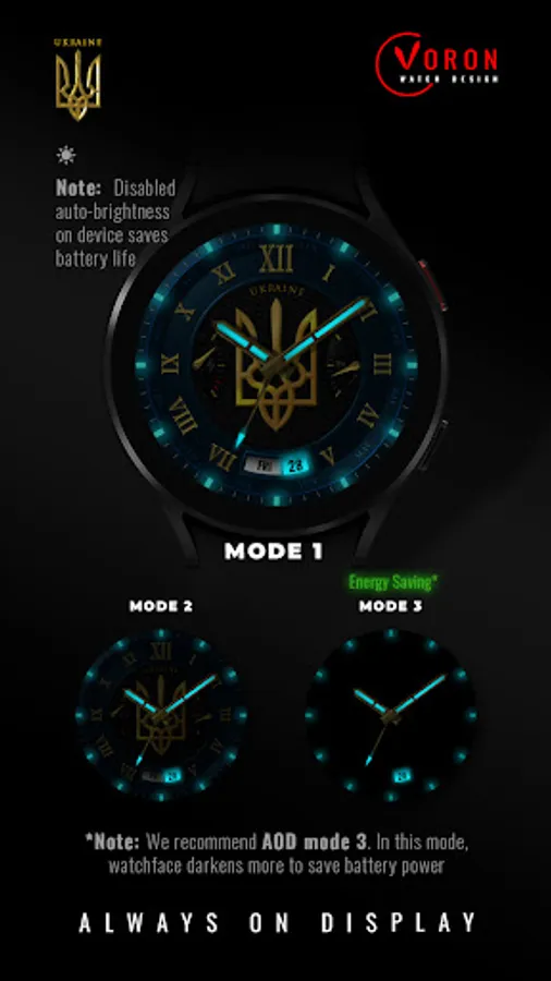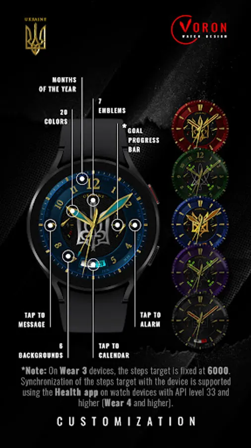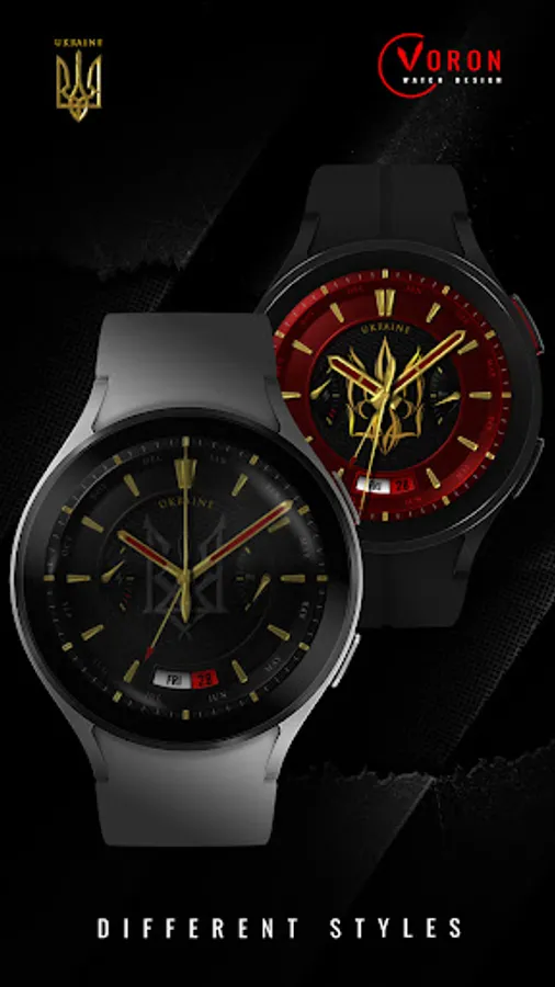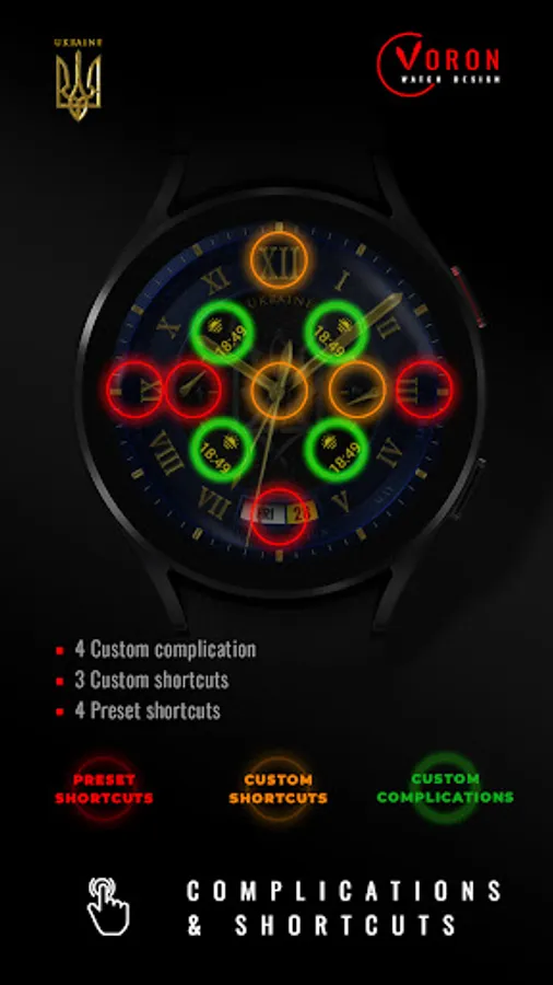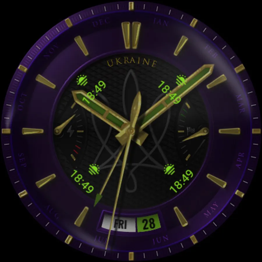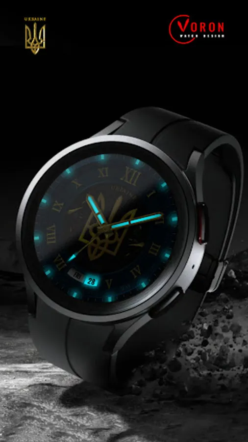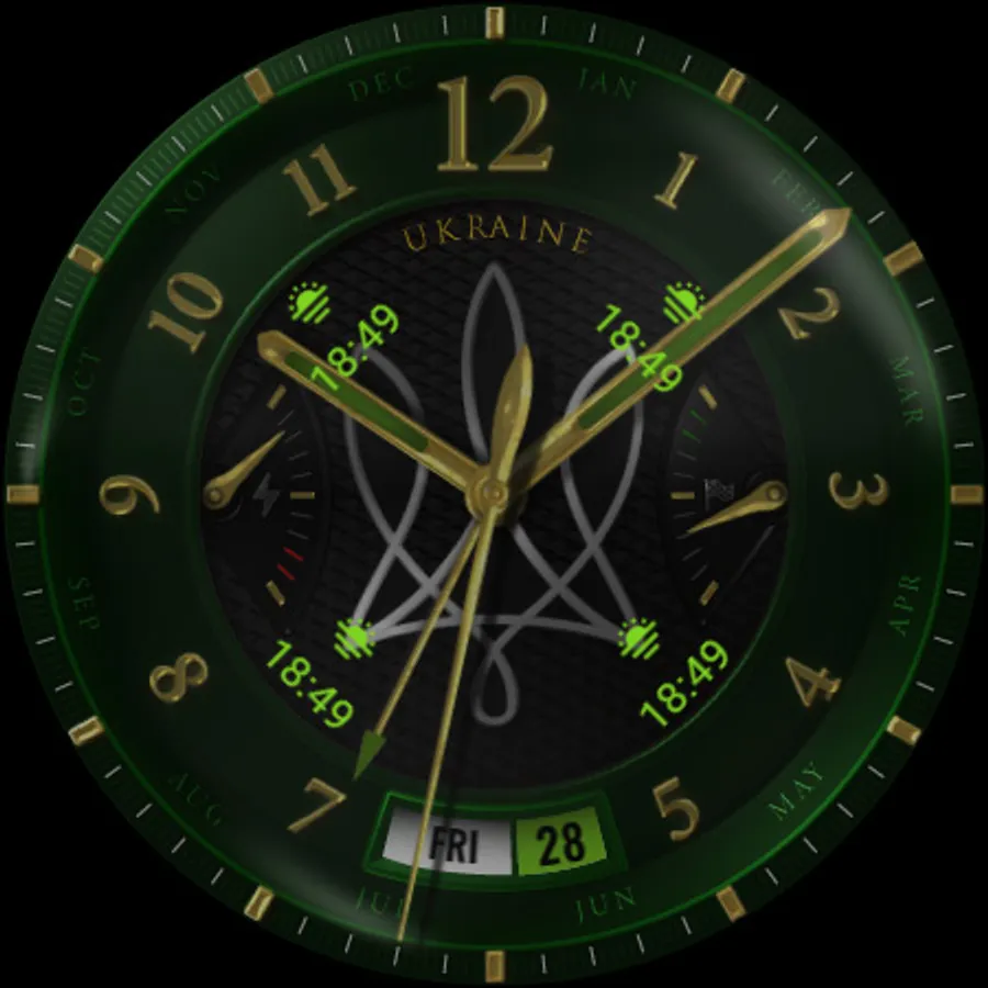 Customizable realistic analog watch face with coat of arms of Ukraine in different styles. Different backlight colors, time indicators and watch face hand styles for personalization.