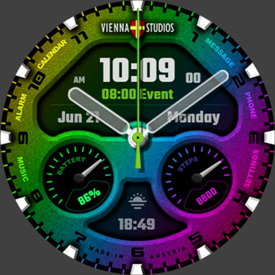 It contains time, date, day, steps (your fitness progress). VIENNA STUDIOS produced so far more than 4K Watch Faces at different platforms. All the gained expertise is flown into this watchface.