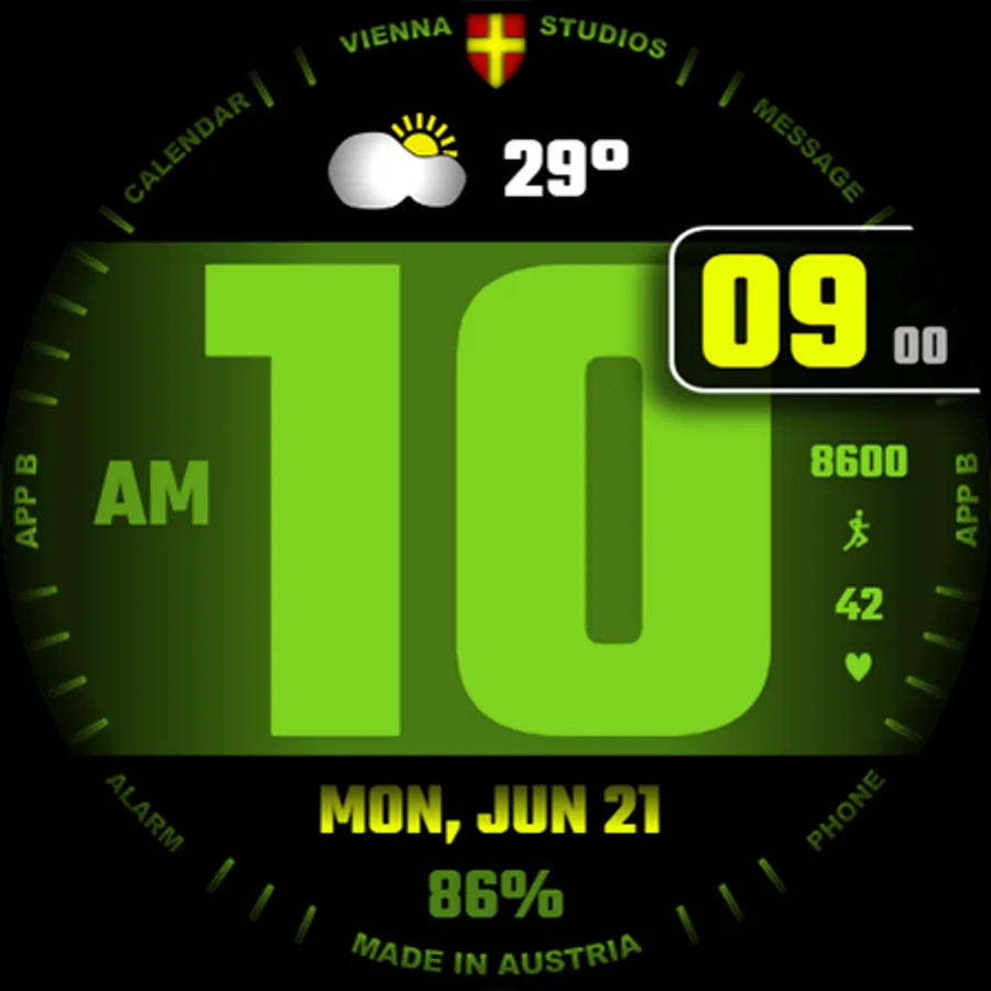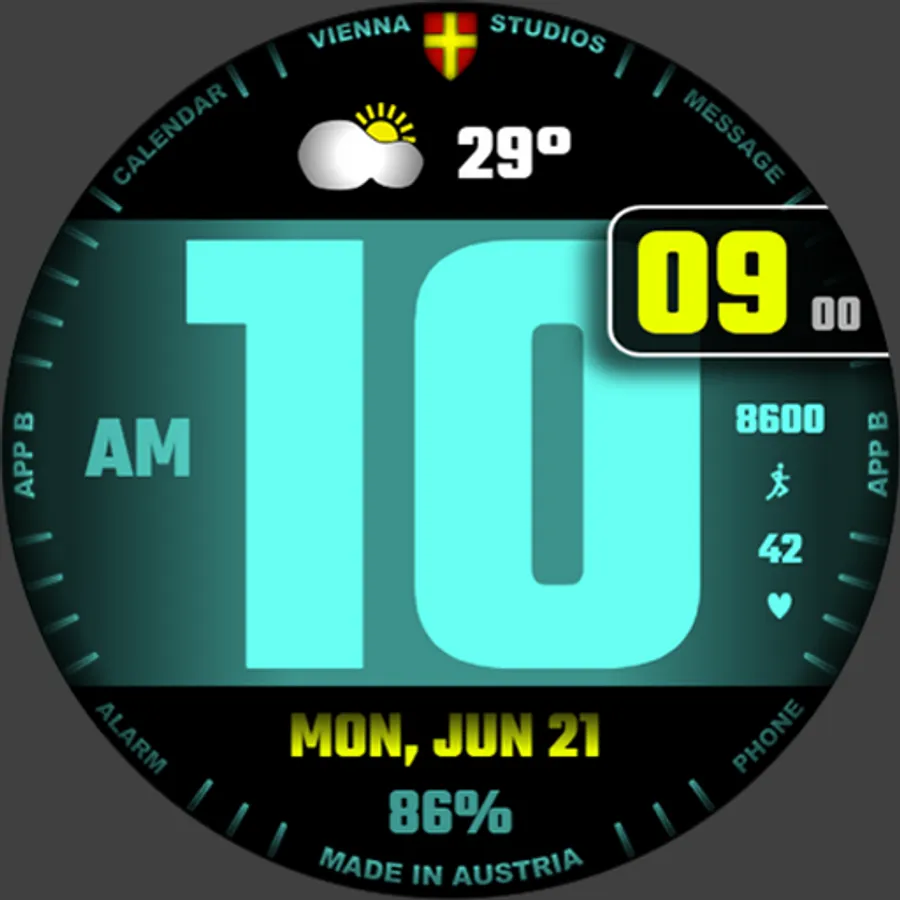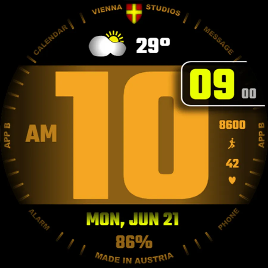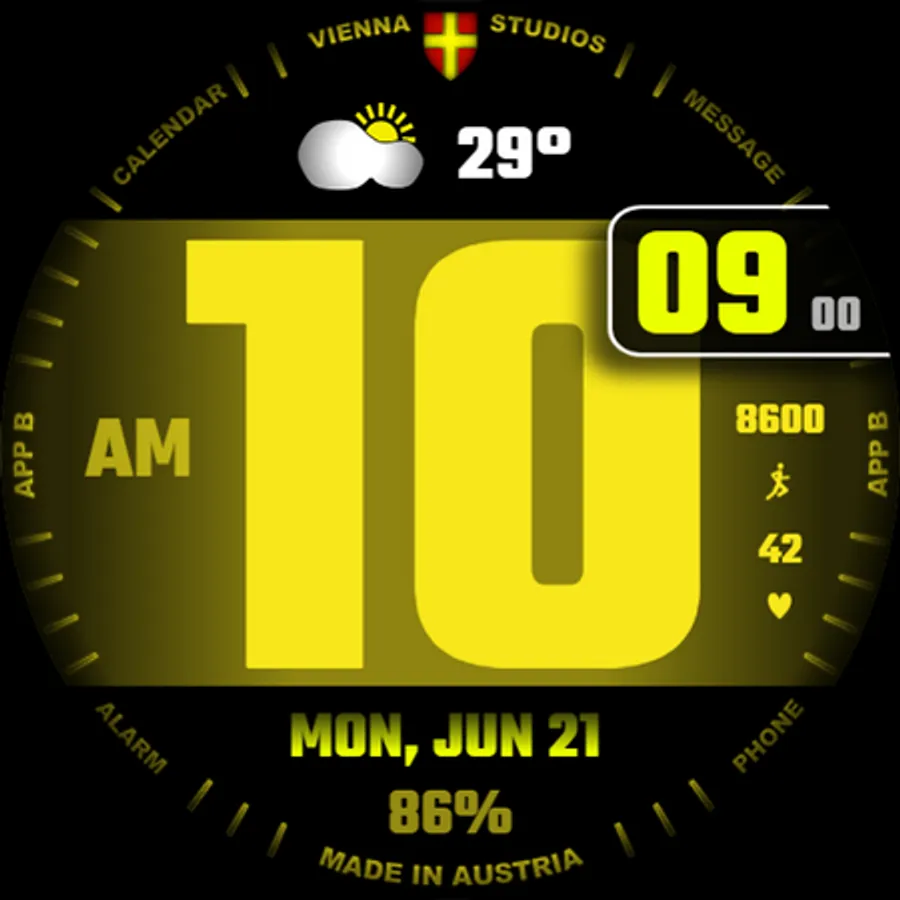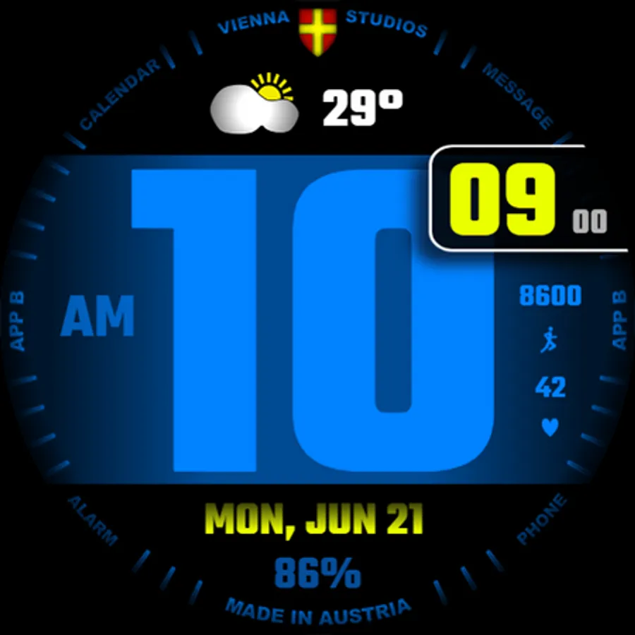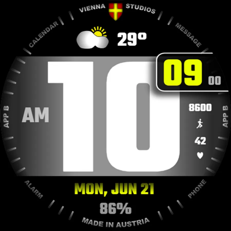 It contains time, date, day, steps (your fitness progress). VIENNA STUDIOS produced so far more than 4K Watch Faces at different platforms. All the gained expertise is flown into this watchface.
