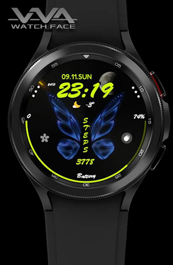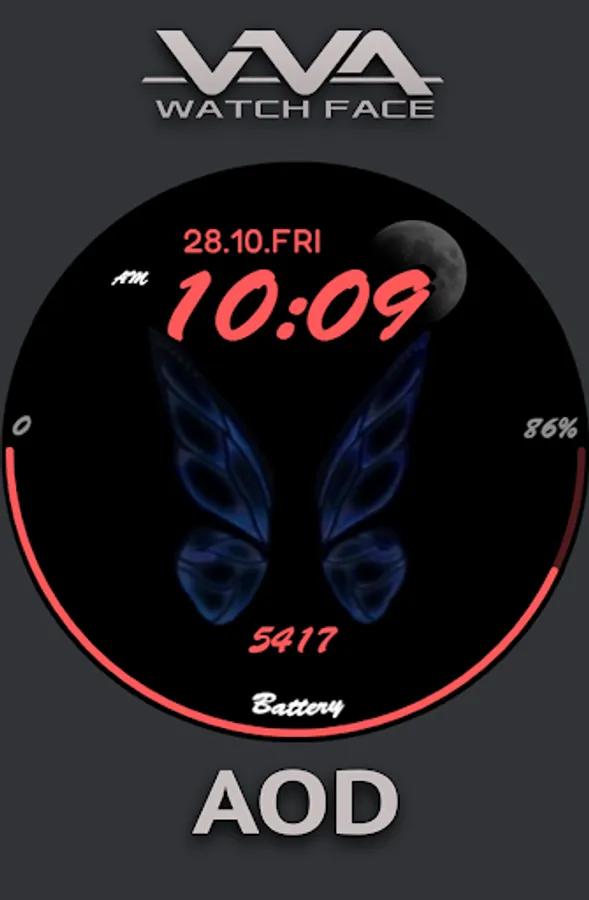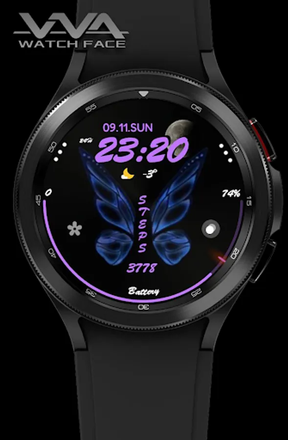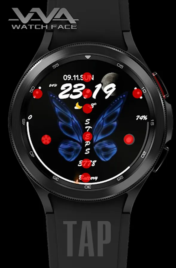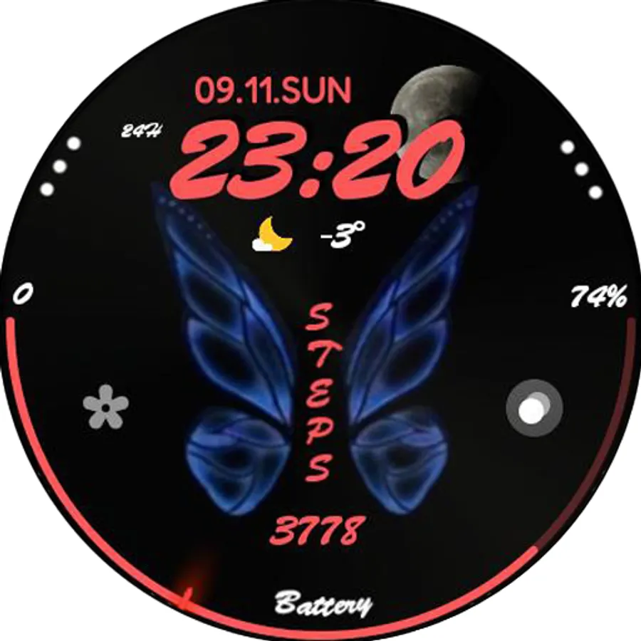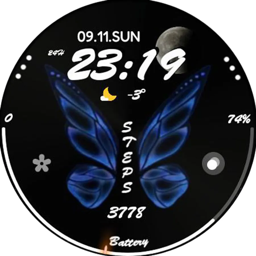 Animated butterfly, Multiple colors, 12/24h, 1-widget, 2-application icons to choose from, 2-hidden application icons, Tap-calendar, alarm clock, battery status, settings.