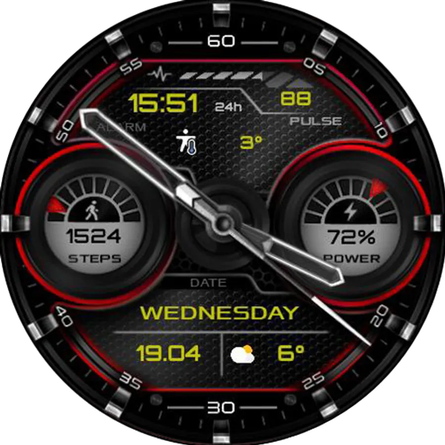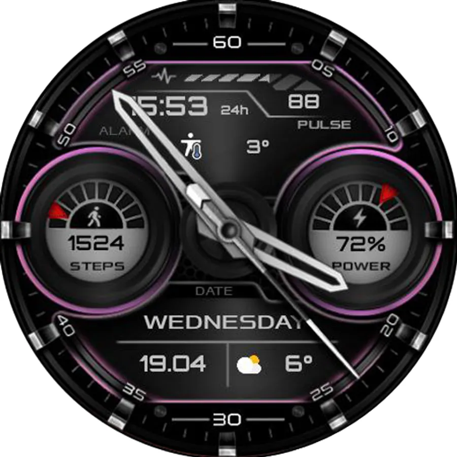 12/24h, color selection, 2-widgets, arrow selection, 2-AOD modes, giro beams to choose from, TAP alarm, steps, battery status, calendar