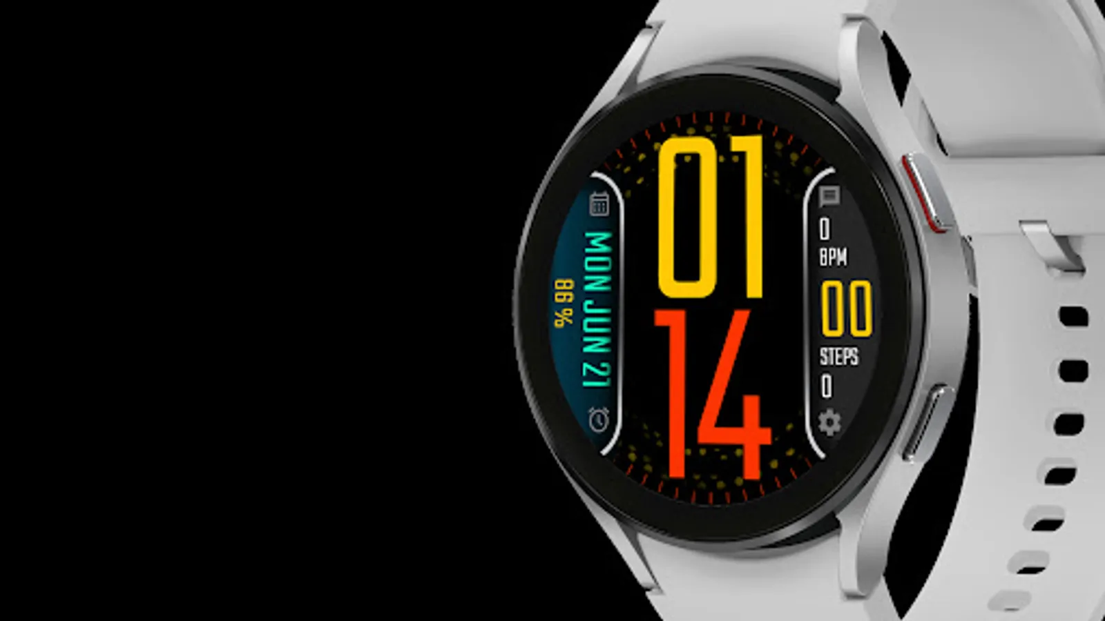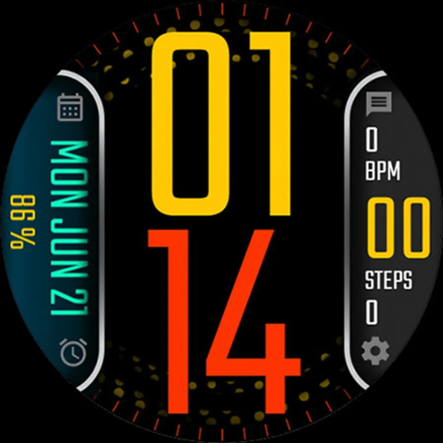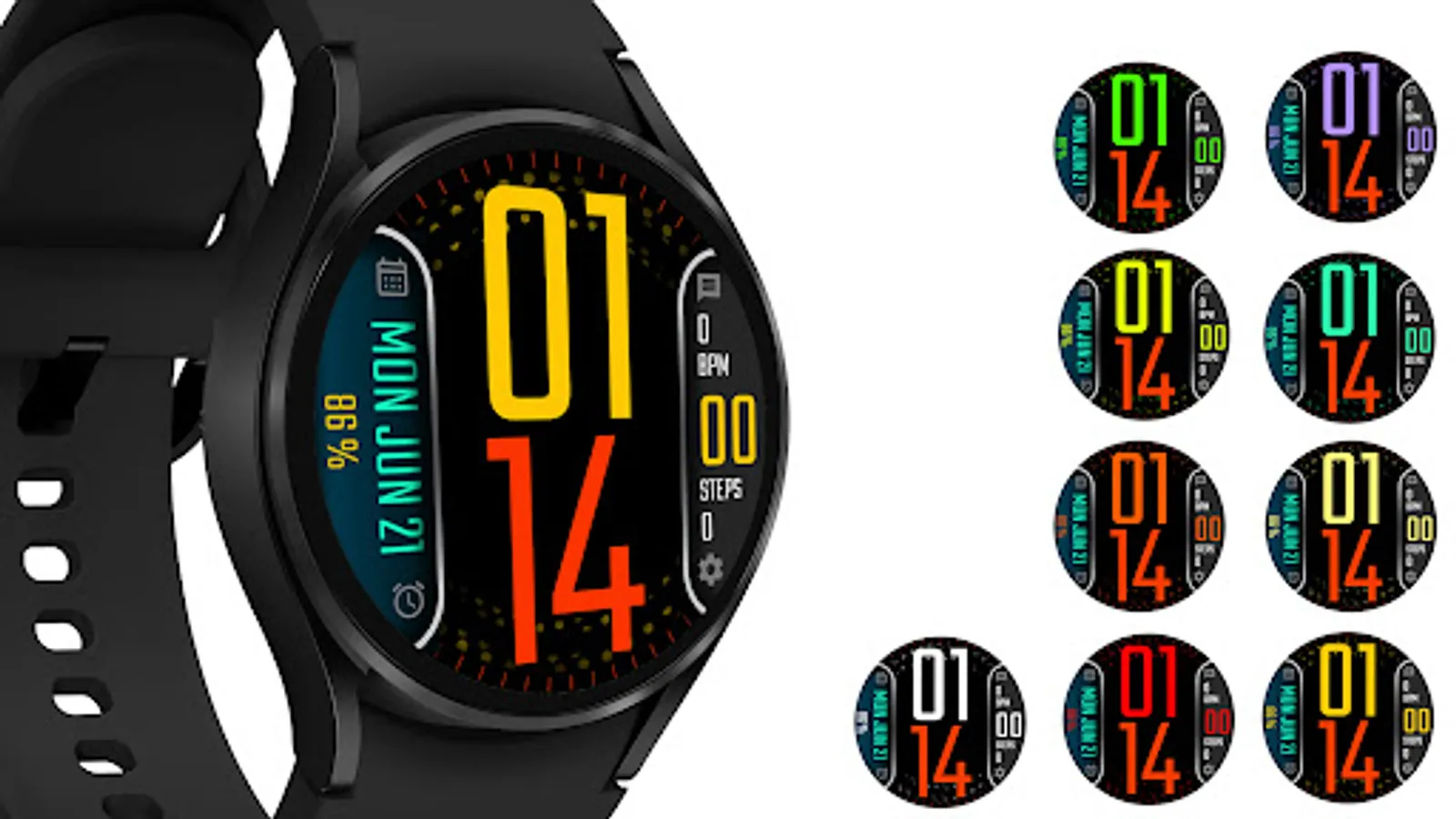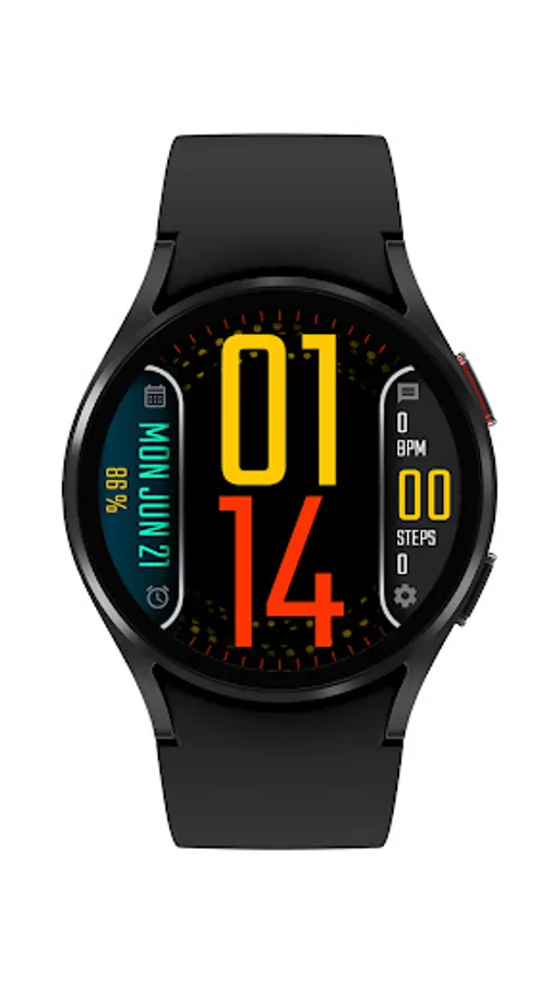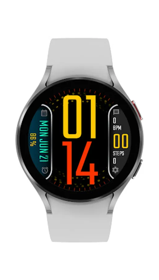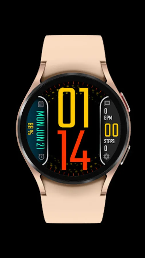 Digital watch face with date, steps, heart rate and battery and 10 different theme picker. Also enjoy the background dot animation which color is changeable based on theme.