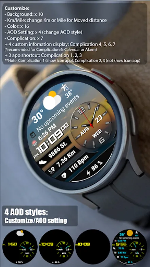 + 4 custom infomation display zone: Complication 4, 5, 6, 7 (* recomended for Complication 6: Calendar or Alarm)