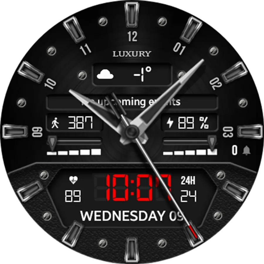 - Custom widgets (for example - weather, steps, dual time, barometer, etc.);