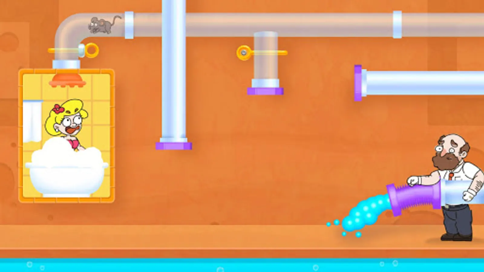 There's no water in the shower! Hook up the water pipe and help her!