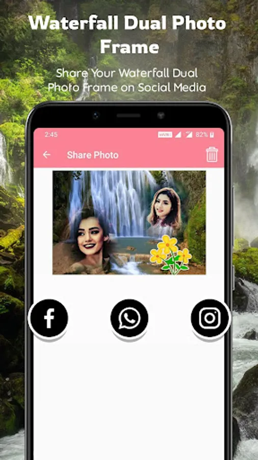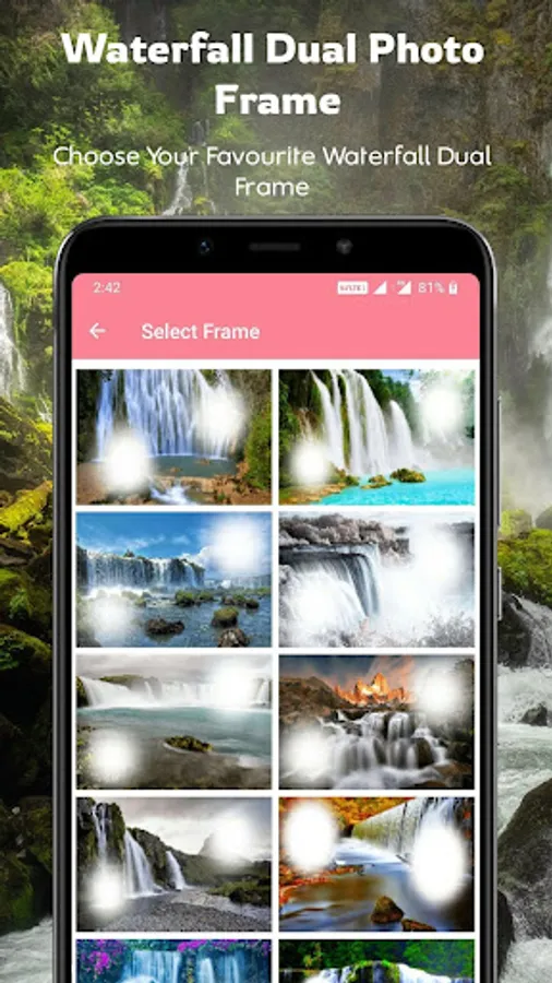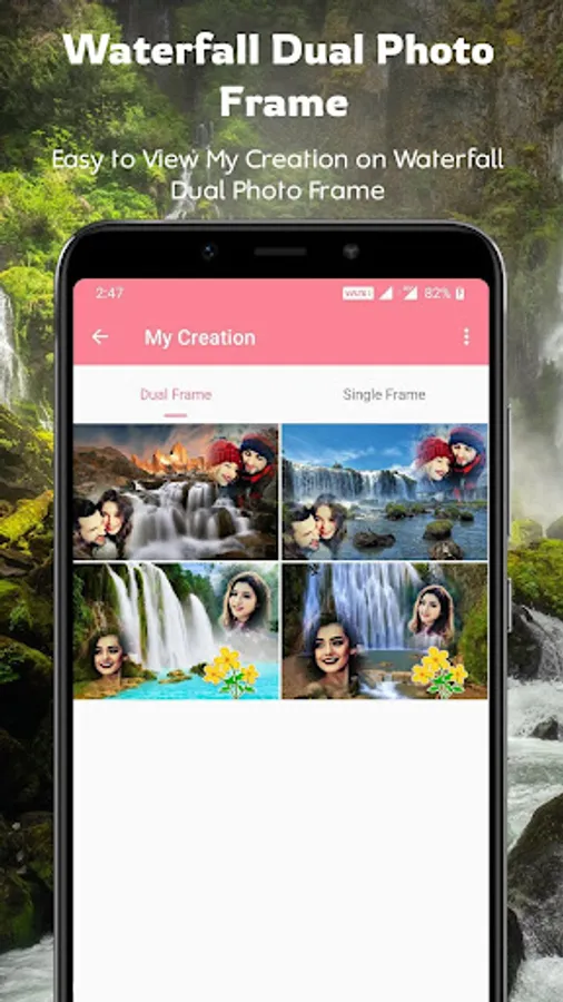 Select any photo from gallery or take a picture using camera and embed the photo of your choice into beautiful waterfall dual photo frames.