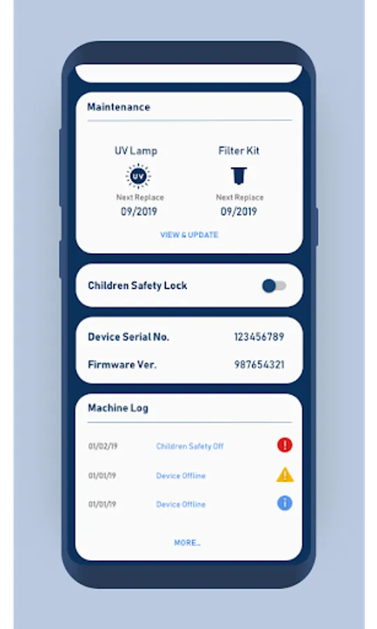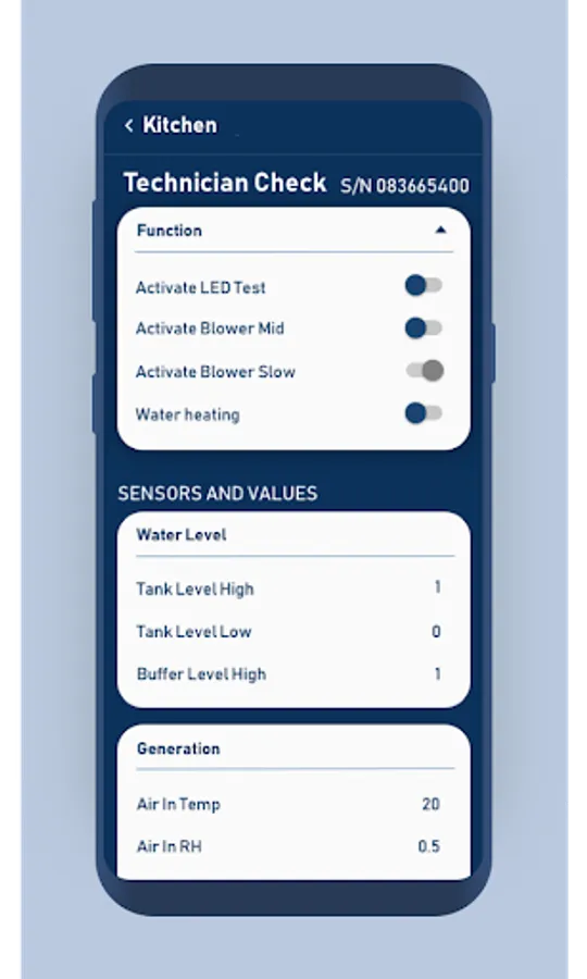 The app will be used by a technician who comes by request to install or perform any maintenance operations on the machine. Easy troubleshooting is available on the technician screen login, with access to heating status, blower status, water tank levels, buffer tank levels, air temp, all operational sensors.