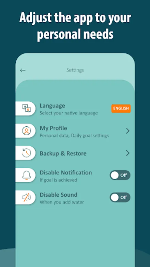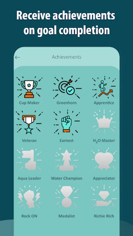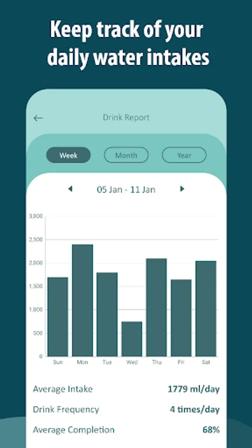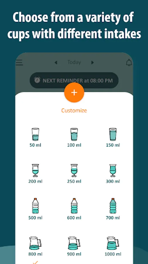 - Choose the amount of water you intake from 12 different pre-defined containers