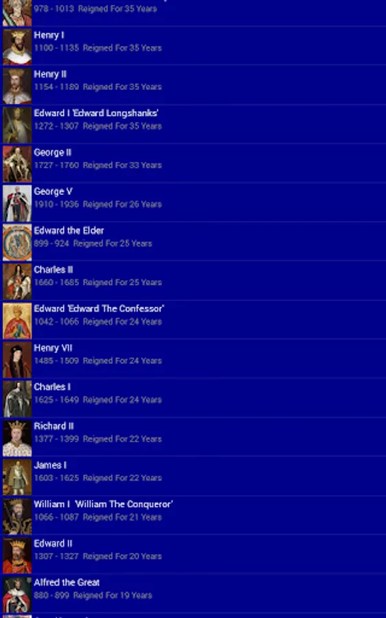 It contains a year-by-year database of significant dates in history from the Roman Conquest in AD43 to the present day. The database can be searched for a given year and the events of that year (+/- a few years) are displayed. Alternatively a word (or part word) search will display all years where that clue is found. The App also has a graphical portrait database of British Monarchs from Alfred The Great to Elizabeth II who may be browsed by date or longevity of their reign. The graphics are optimised for full-size tablets but scale equally well to smaller screens.