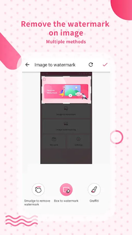 You can easily remove watermark or background from your photo and save the transparent image in PNG or JPG format! Select a photo from the album, enlarge and move photo then adjust the brush size to smear and remove watermark. The resulting images can be shared to Instagram, Facebook and Twitter.