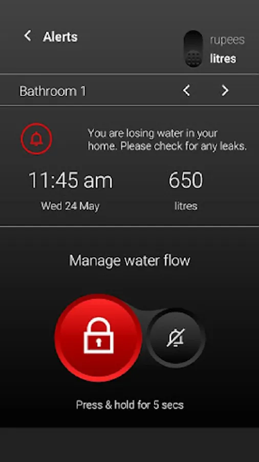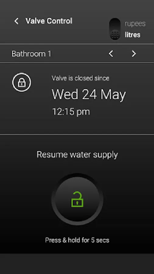 New - Valve Operation- Close and open valve instantly by pressing a button. A countdown of 5 seconds avoids accidental operation. You will get a notification on completion. A word of caution - this facility is only to be used in the case of an abnormal flow, or in case you are leaving the apartment closed for extended periods of time. It is not expected to be used as an alternative to the tap.