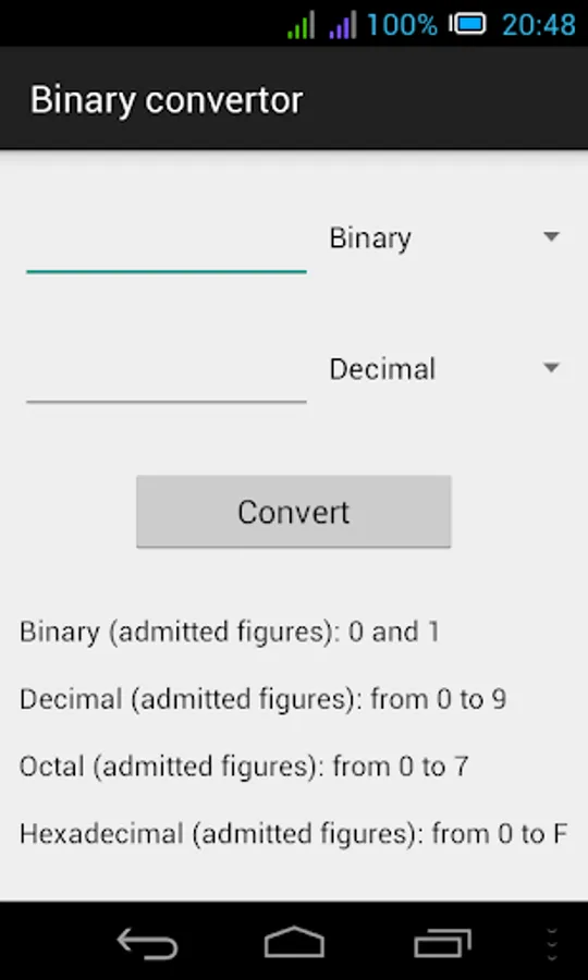 The application is useful for making conversions between binary, octal, decimal and hexadecimal figures.