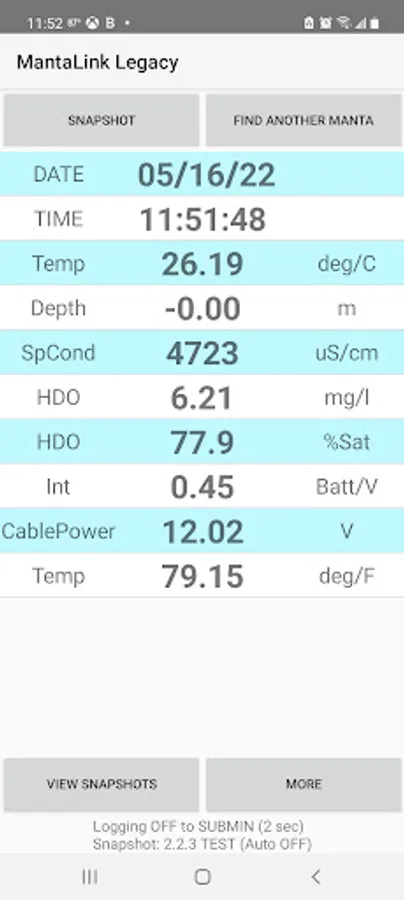 Connects to a Eureka Water Probes Manta multi-probe via Bluetooth Classic. Allows monitoring and recording of sensor readings, and export of those readings to the Android file system or via email.