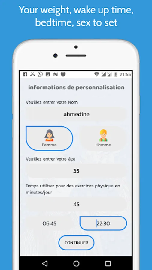 - Accessing personalization by specifying your name, weight, wake-up time, bedtime, and time to exercise