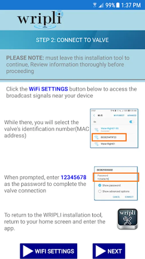 Wripli's Installer Setup application walks the installer through the process to initiate the valve's "broadcast mode" and connect it to the home owner's wireless router. This process must be done for every newly installed Wripli system.