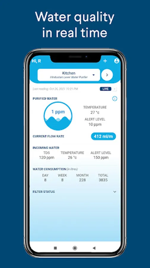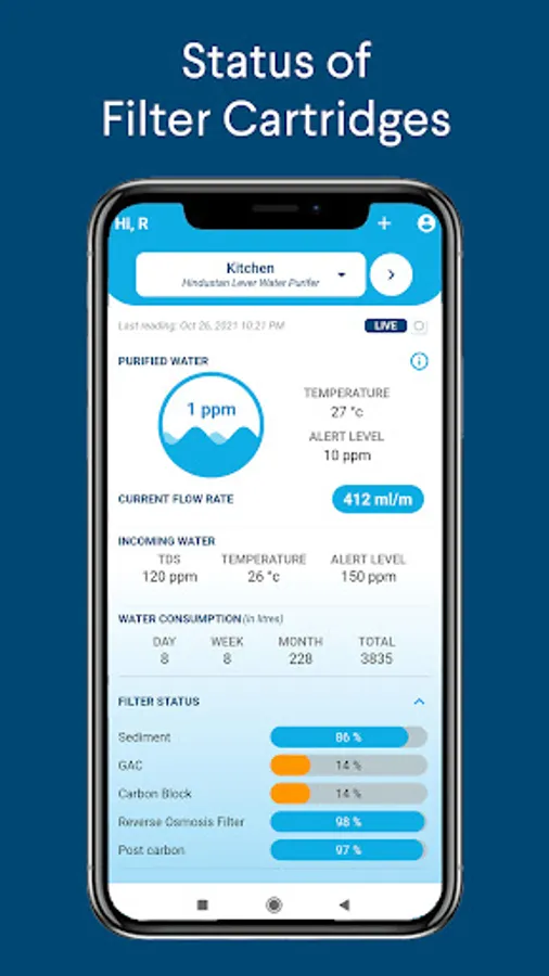 TDSBot tracks incoming and purified water TDS (ppm), temperature, volume of water filtered and its flow rate in your reverse osmosis water filter system. It provides you with real time quality of water, total water filtered, and status of filter cartridges. It notifies you about water quality, leaks, blockage, abnormal temperature and predictive filter maintenance alerts so that you can proactively take action to ensure that your system runs efficiently and ensure good potable water always. Visualize system dashboard, device setup, configure alerts using the free app.