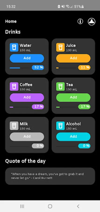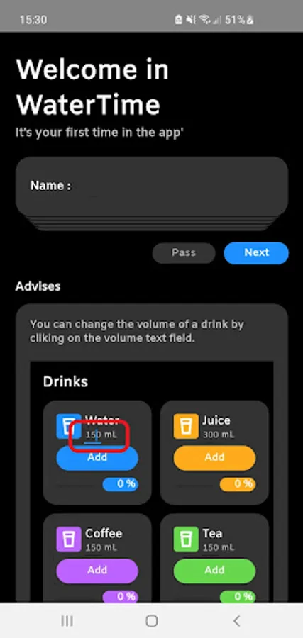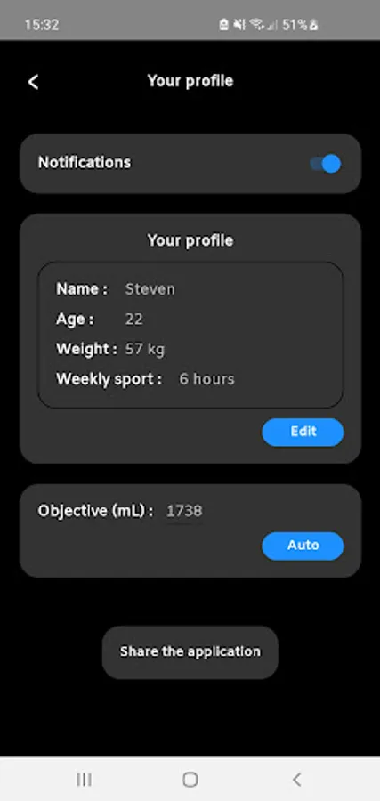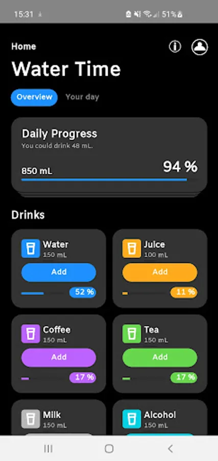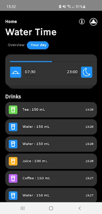 Thanks to Water Time, you can monitor your consumption at any moment to follow your global objective. The app calculate how much water you should drink depending on your wake up time, bed time and daily objective.