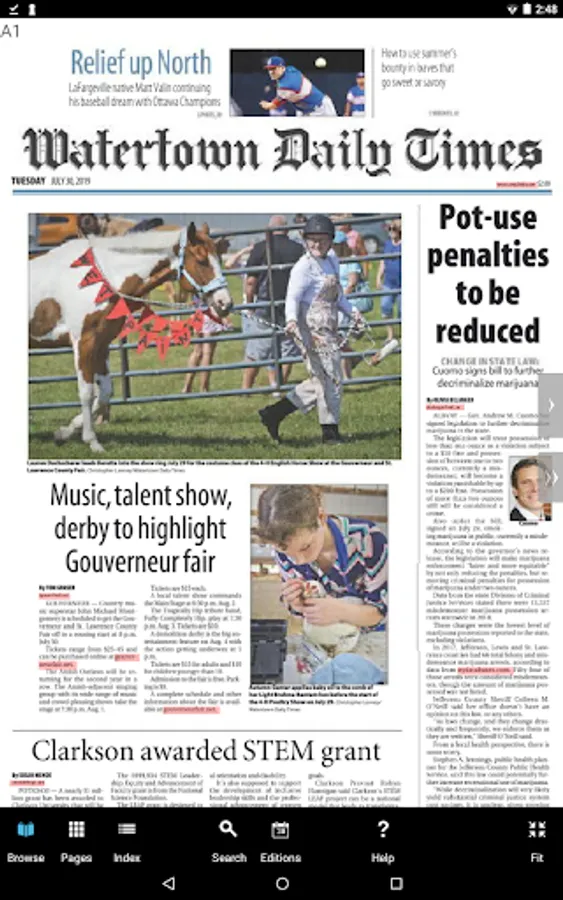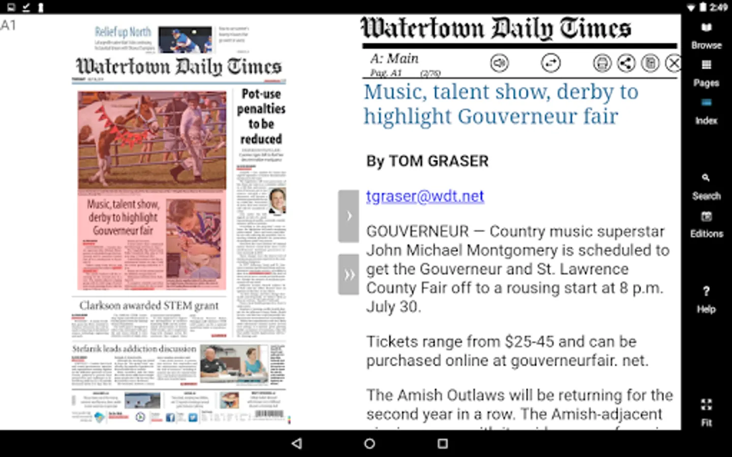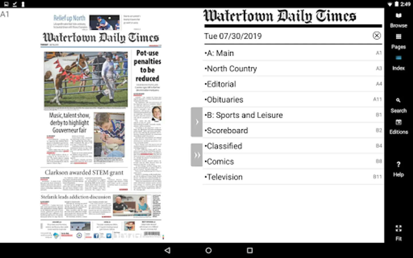 Your award winning local newspaper, The Watertown Daily Times, is now available in an app for Android. The app lets subscribers read their favorite local newspaper on an Android tablet with all the stories, obituaries, editorials, ads, and photos show exactly as they appear in print. The app uses multi-touch screen features to provide fast and easy navigation and a newspaper like reading experience.