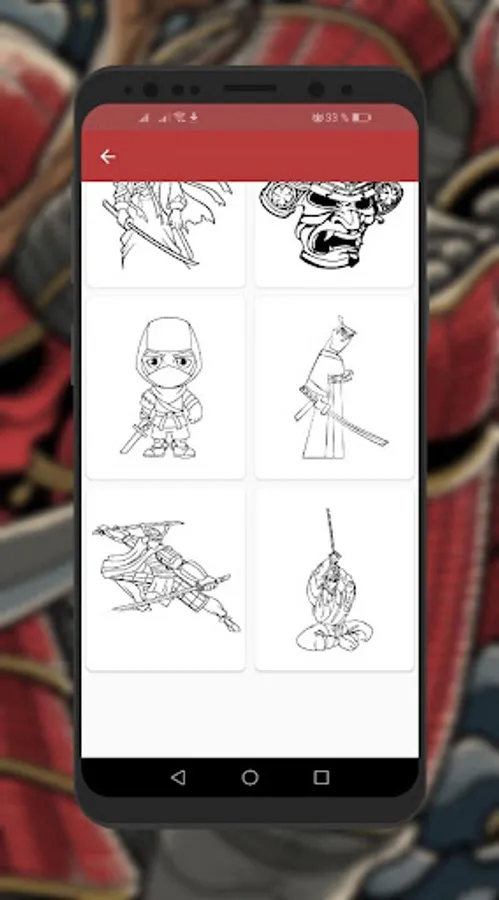 The coloring book presents drawings of different images of Samurai such as ronin, assassin, ninja and others. There is also a collection of samurai masks and images with a katana.