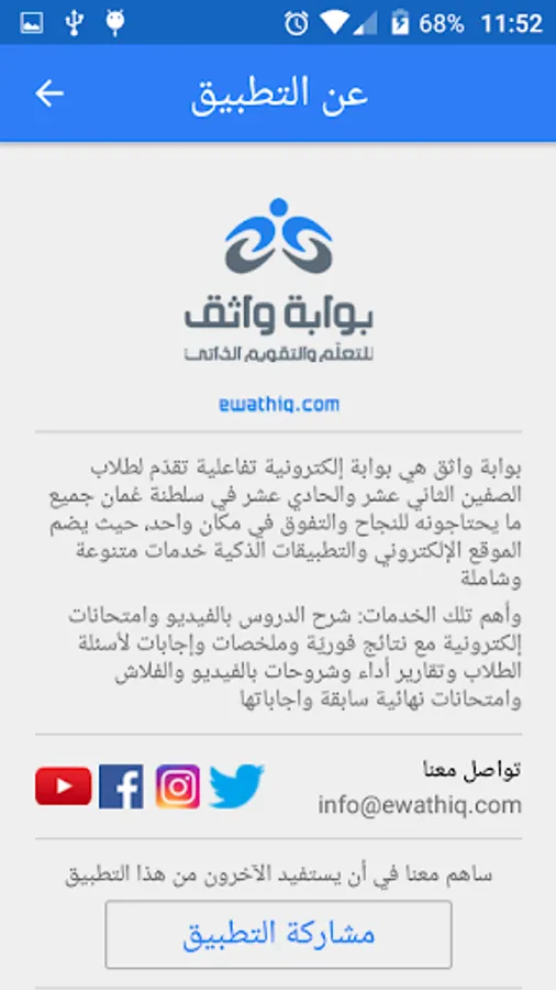 This is the new version of the official App for Wathiq IT educational portal (ewathiq.com) which provides a number of services for students in grades 12 and 11 in Oman.