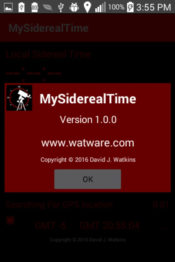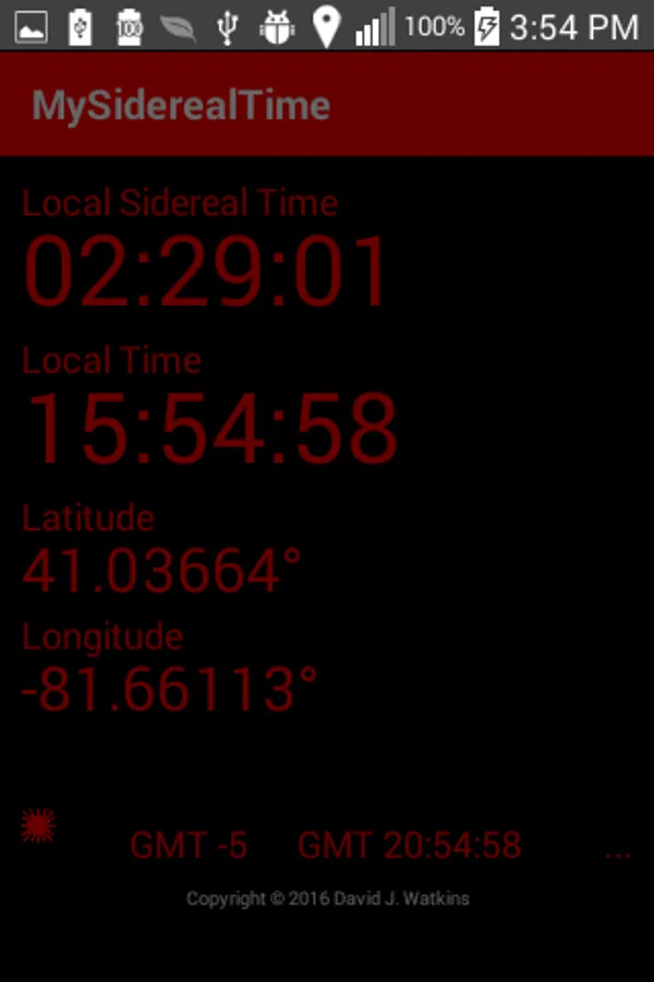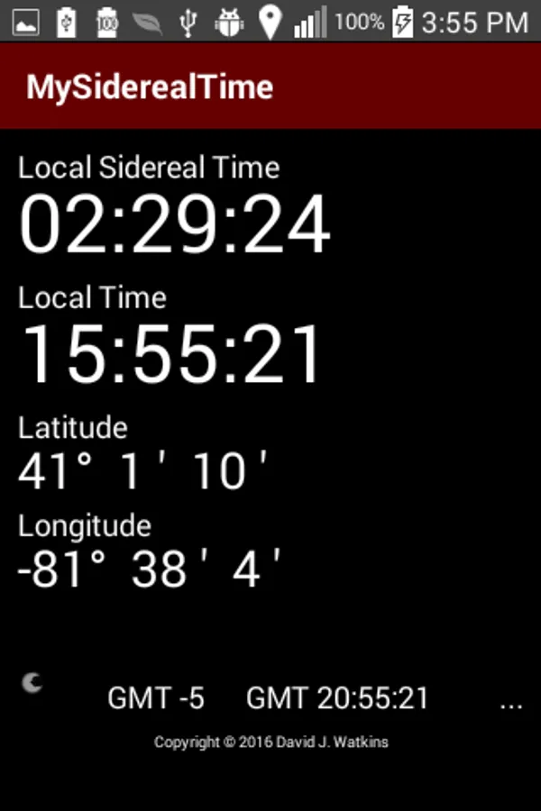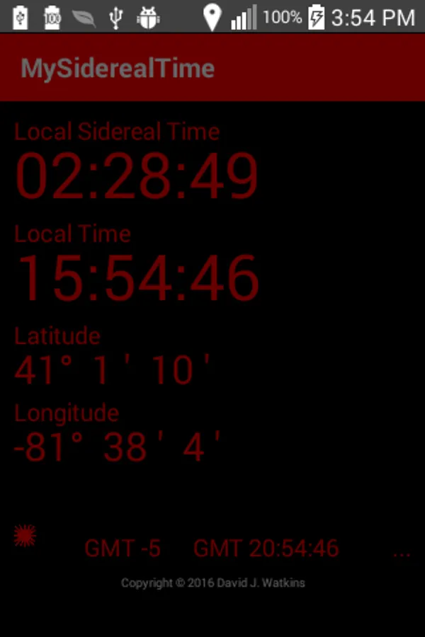 An app for Astronomy and Astrophotography enthusiasts. MySiderealTime is a useful Sidereal Clock utility to assist you while you use your telescope and mount during your astronomy viewing session or for your night of astrophotography. The local sidereal time is displayed in hours minutes and seconds in 24 hour format. The local time is also displayed, and by tapping the local time, it will toggle between 12 and 24 hour formats. Latitude and Longitude can be displayed in either decimal degrees or in degrees, minutes, seconds. Tapping the Latitude and Longitude display will toggle between formats. The display defaults to night vision mode as to not disturb your night vision. For viewing indoors or in bright sunlight, the display can be switched to day vision mode by tapping on the sun icon. The display can be switched back by tapping on the moon icon. The device GPS sensor is used to determine your exact location so the correct Sidereal Time can be displayed along with your latitude and longitude coordinates. The display will also show the current GMT, your local offset from GMT, and if (DST) Daylight Savings Time is in effect.
