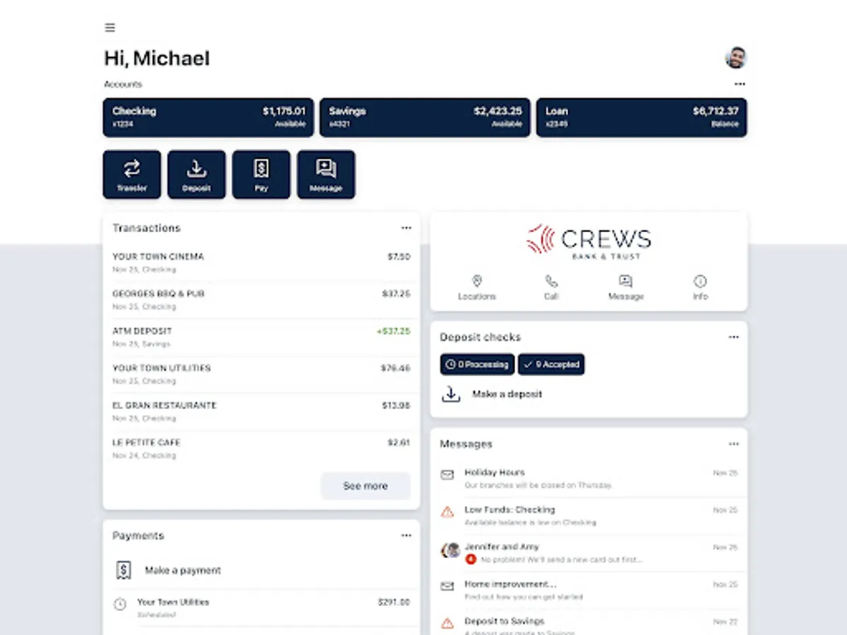 Crews Bank is your personal financial advocate that gives you the ability to aggregate all of your financial accounts, including accounts from other banks and credit unions, into a single view. It’s fast, secure and makes life easier by empowering you with the tools you need to manage your finances.