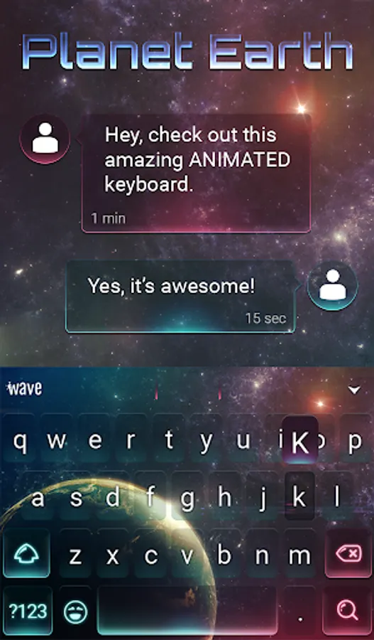The custom keyboard design with animated graphics is a great match for the cool live wallpaper. This keyboard makes writing fun with rich communication features. First, you have an amazing design of your choice for visual delight. Customize along with fonts, vivid colors and funny sounds just the way you like it. Over 800 emojis are available to express emotions easily using the colorful keyboard background. If you are a GIF fan, you’ll love the collection linked to Wave Animated Keyboard. Plus, you can even create an instant GIF to reveal your thoughts. On top of good looks and fun ways to communicate, Wave Animated Keyboard offers some smart writing tools. The auto-correct feature supports over 20 languages. Your hands are free to do something you enjoy more than writing using the voice input option: