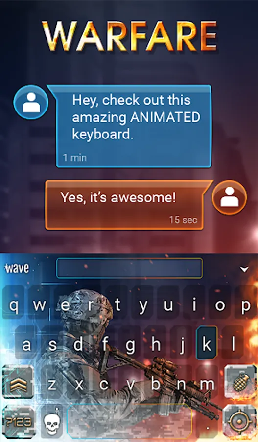 Warfare Animated Keyboard + Live Wallpaper is an awesome personalization app that gives your Android phone a stylish new look. With Wave cool wallpapers and keyboards apps, it is easy to revamp a device in just 3 steps: