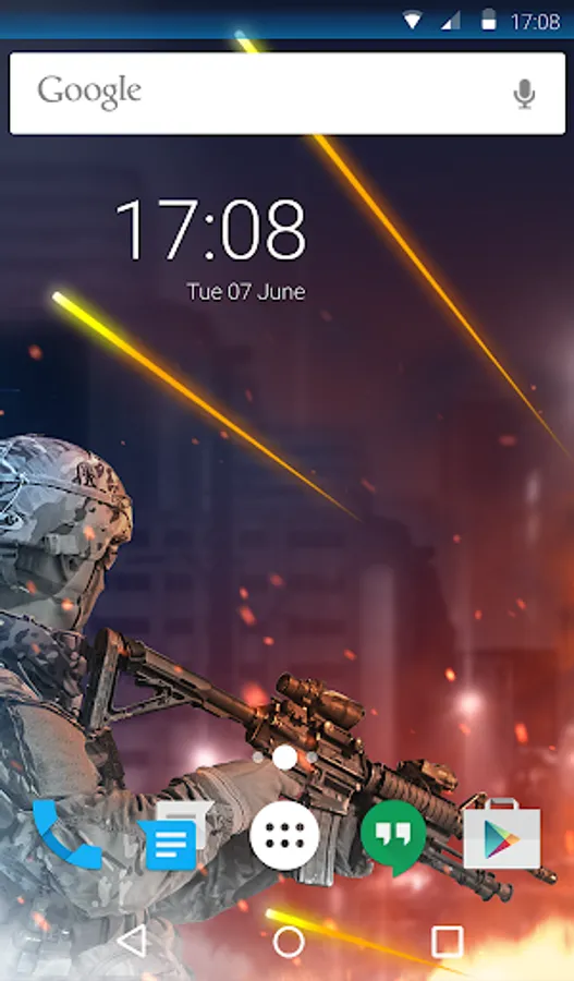 The custom call screen design is the final touch of our free theme Warfare Animated Keyboard + Live Wallpaper. Fans of moving backgrounds love this cool dynamic twist. Try this option for a full Android custom look!