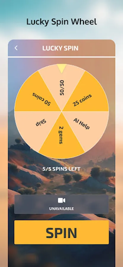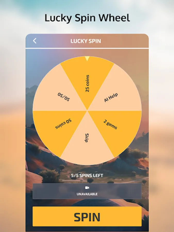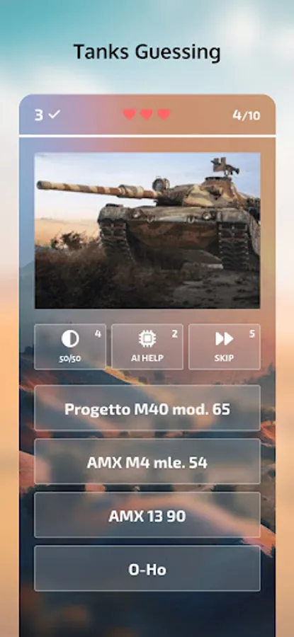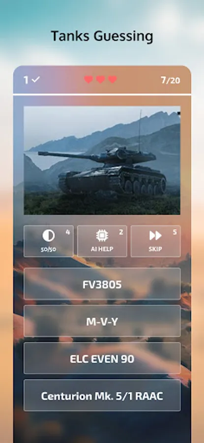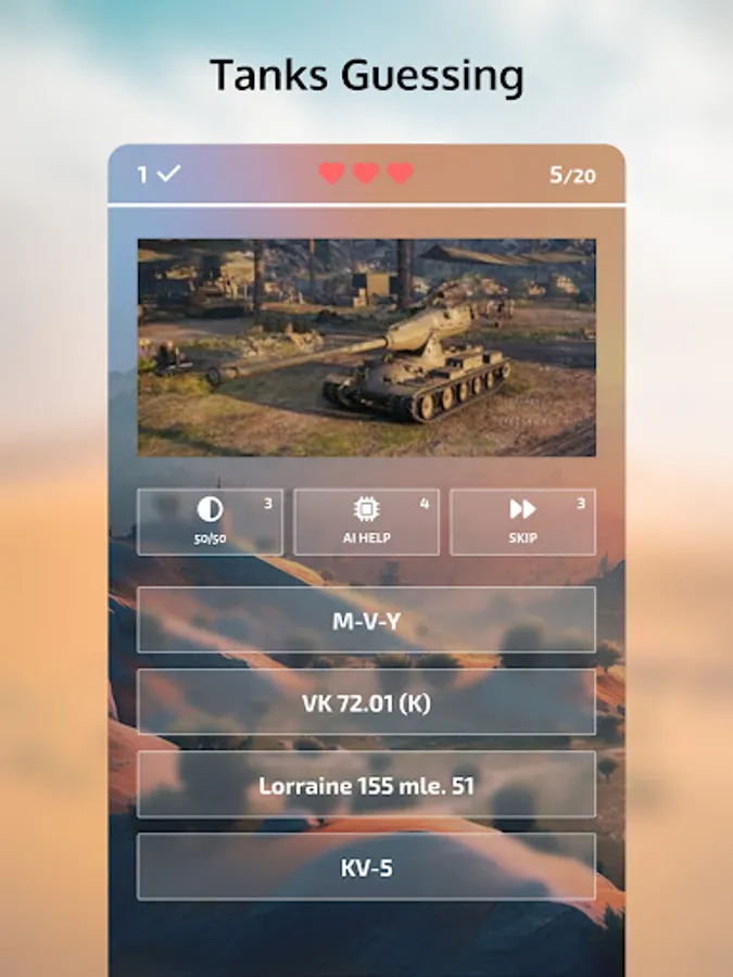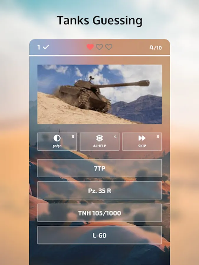 Three types of hints - 50/50, AI Help, and Skip Question - will help you out when you're stuck, but don't rely too much on them because they cost coins. You can earn coins by correctly guessing tanks, and gems by reaching achievements, which you can use to purchase hints or spin the lucky wheel in the internal store.